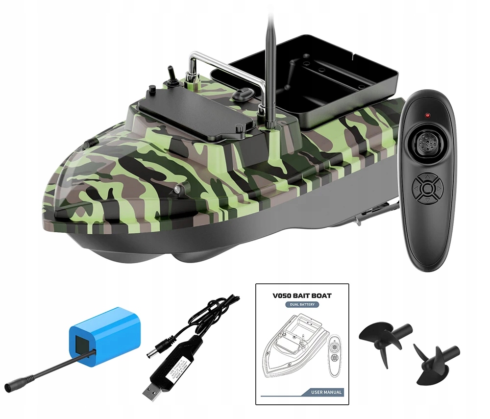 Разом з човном ви отримуєте повний набір: Лі-іонний акумулятор 5200 мАг, USB-зарядний пристрій, дистанційне управління та інструкції в польській мові.