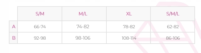 Таблиця розмірів: A: Обхват талії (см) B: Обхват стегон (см)