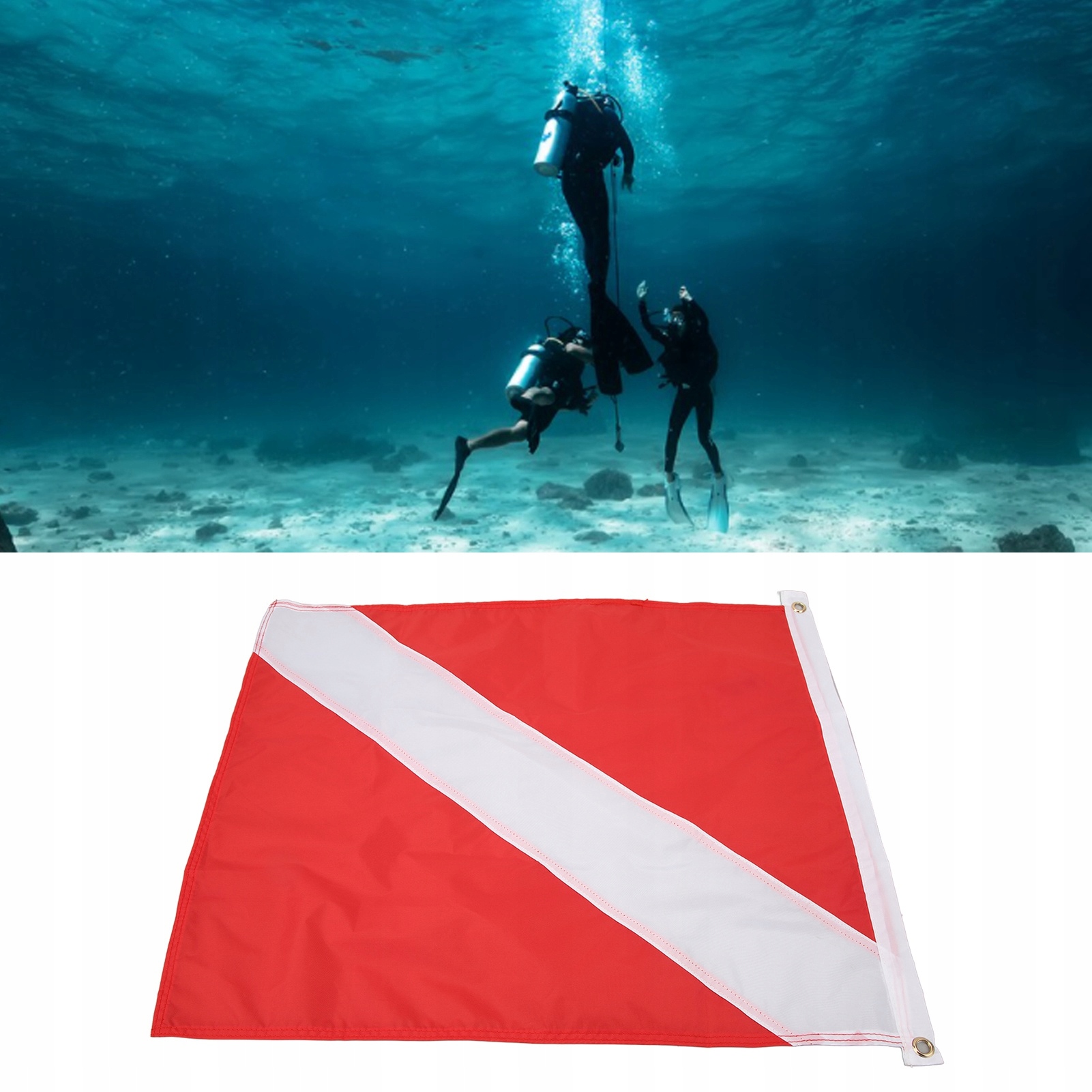 - Застосування: прапор водолаза за бортом використовується для позначення того, що на кораблі є дайвер, а інші кораблі повинні триматися на безпечній відстані від корабля. Підходить для дайвінгу, фрідайвінгу, риболовлі, снорклінгу та інших підводних видів спорту.