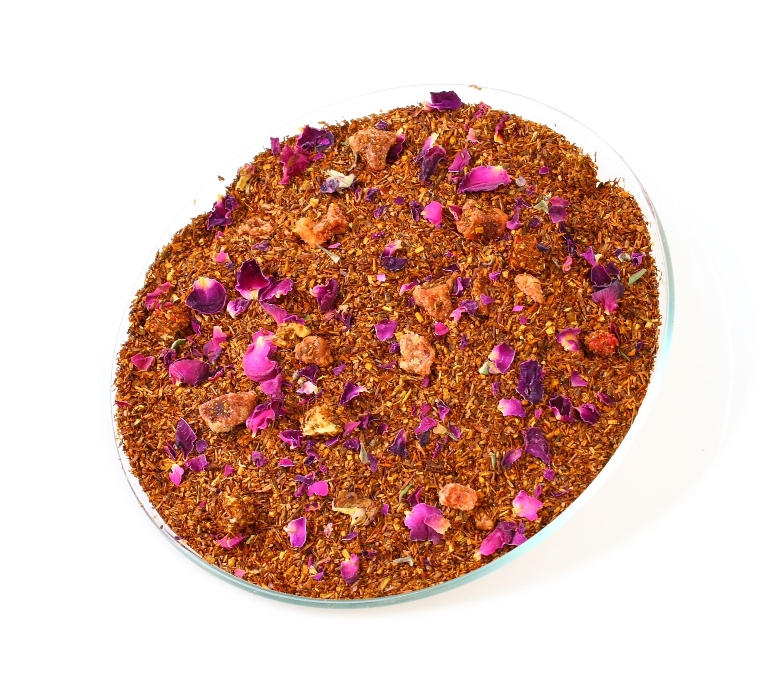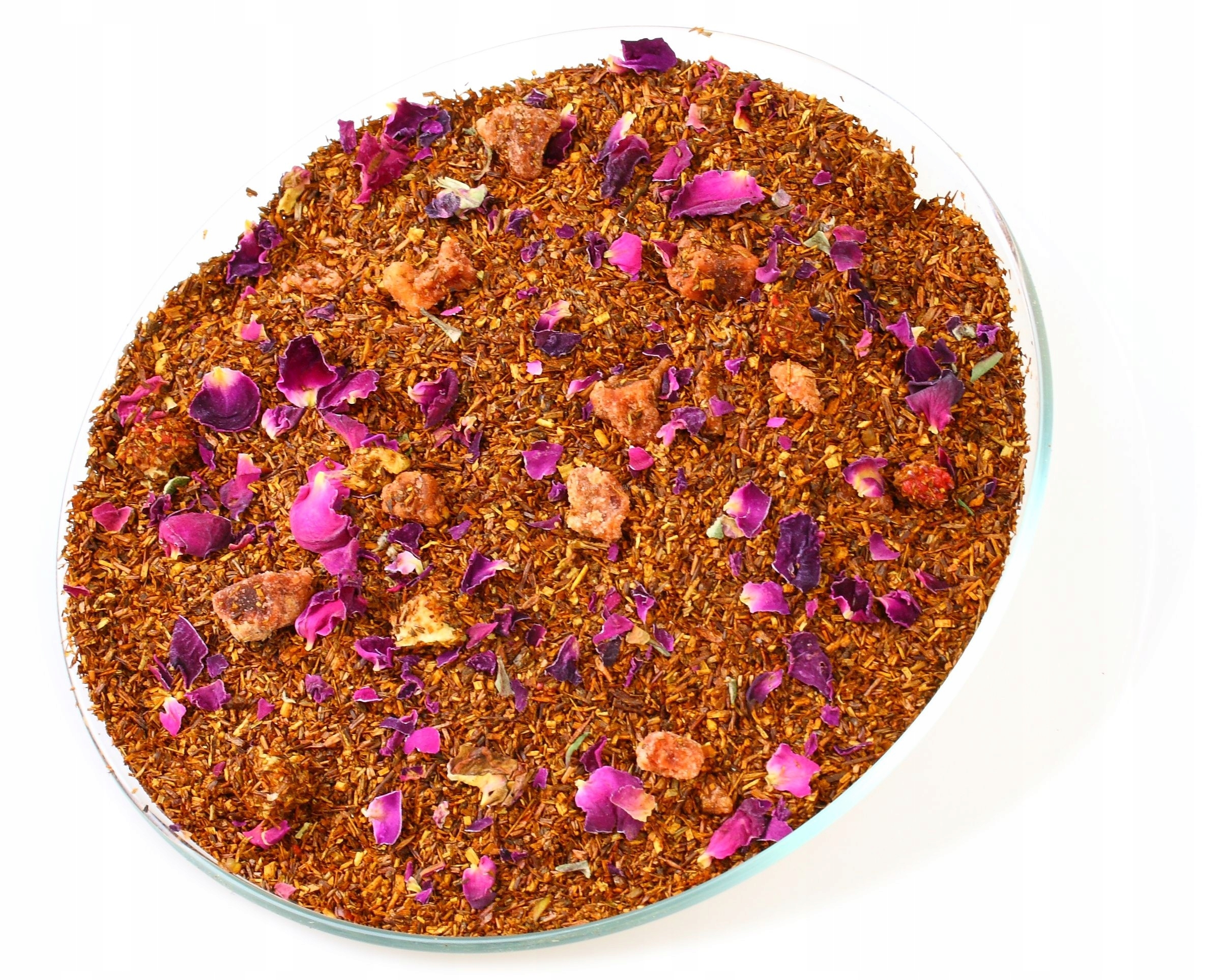 - Ройбуш, цукати полуниці, сублімована суниця 0,3% , пелюстки троянд, аромат.