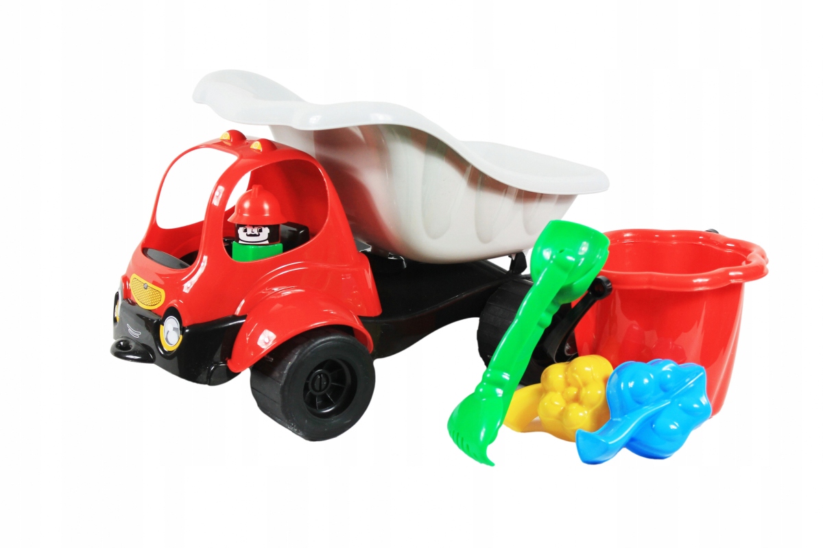 - Набір складається з самоскида "Bączek" з водієм, який додатково збагачений 6 аксесуарами для піску: середніми граблями та лопатою, міні-лійкою та 2 формочками у формі букв. Продукт доступний у різних кольорах. Попередження! Іграшка підходить для дітей від 2 років. Упаковка не є іграшкою, тому забороняється надавати упаковку дітям для гри.
