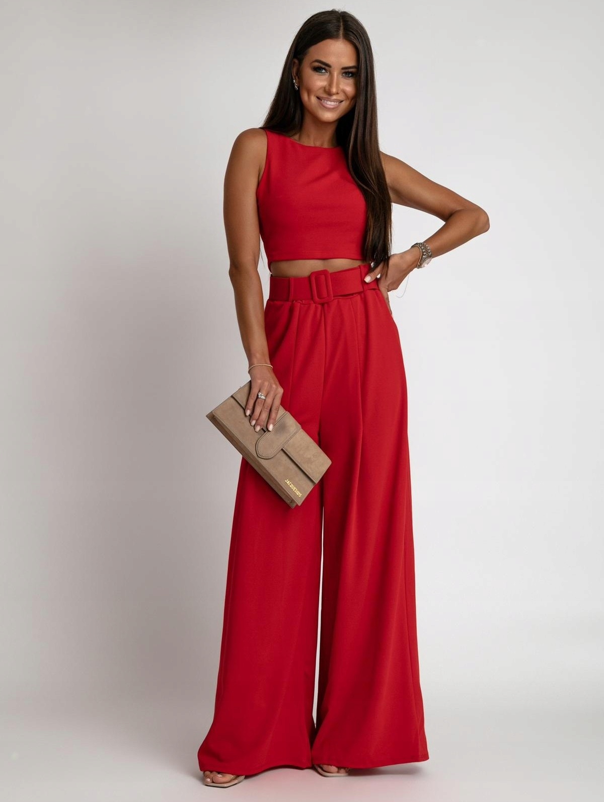 ЧЕРВОНИЙ СТИЛЬНИЙ ЖІНОЧИЙ КОМПЛЕКТ З ПОЯСКОМ, ШИРОКІ ШТАНИ, КОРОТКИЙ ТОП