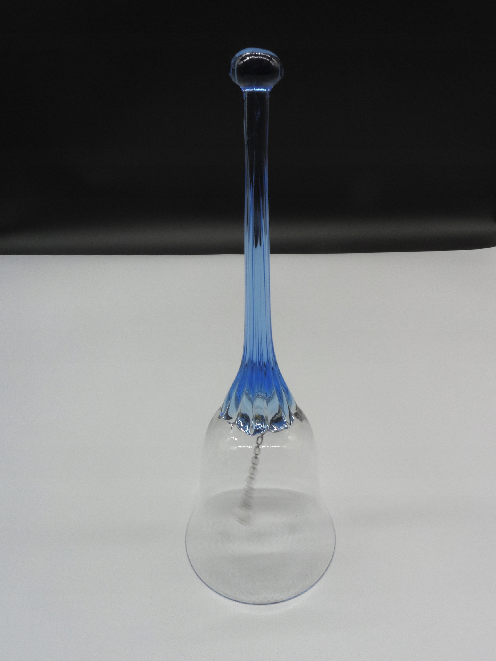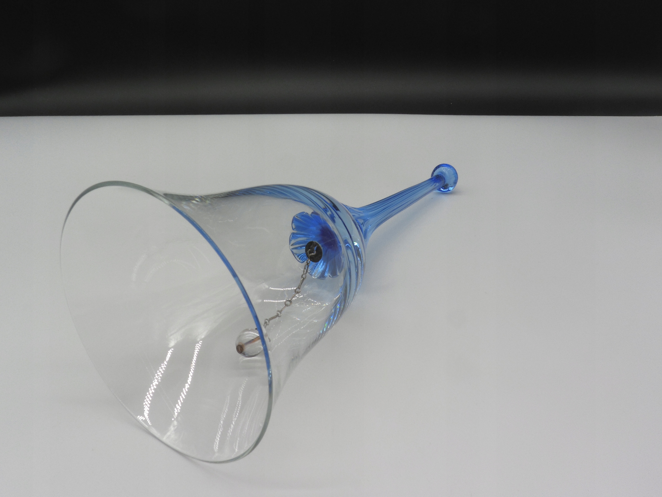 Дзвін має форму чашки та виготовлений із прозорого скла. Довга тонка ручка синього кольору з маленькою круглою кулькою на вершині.
