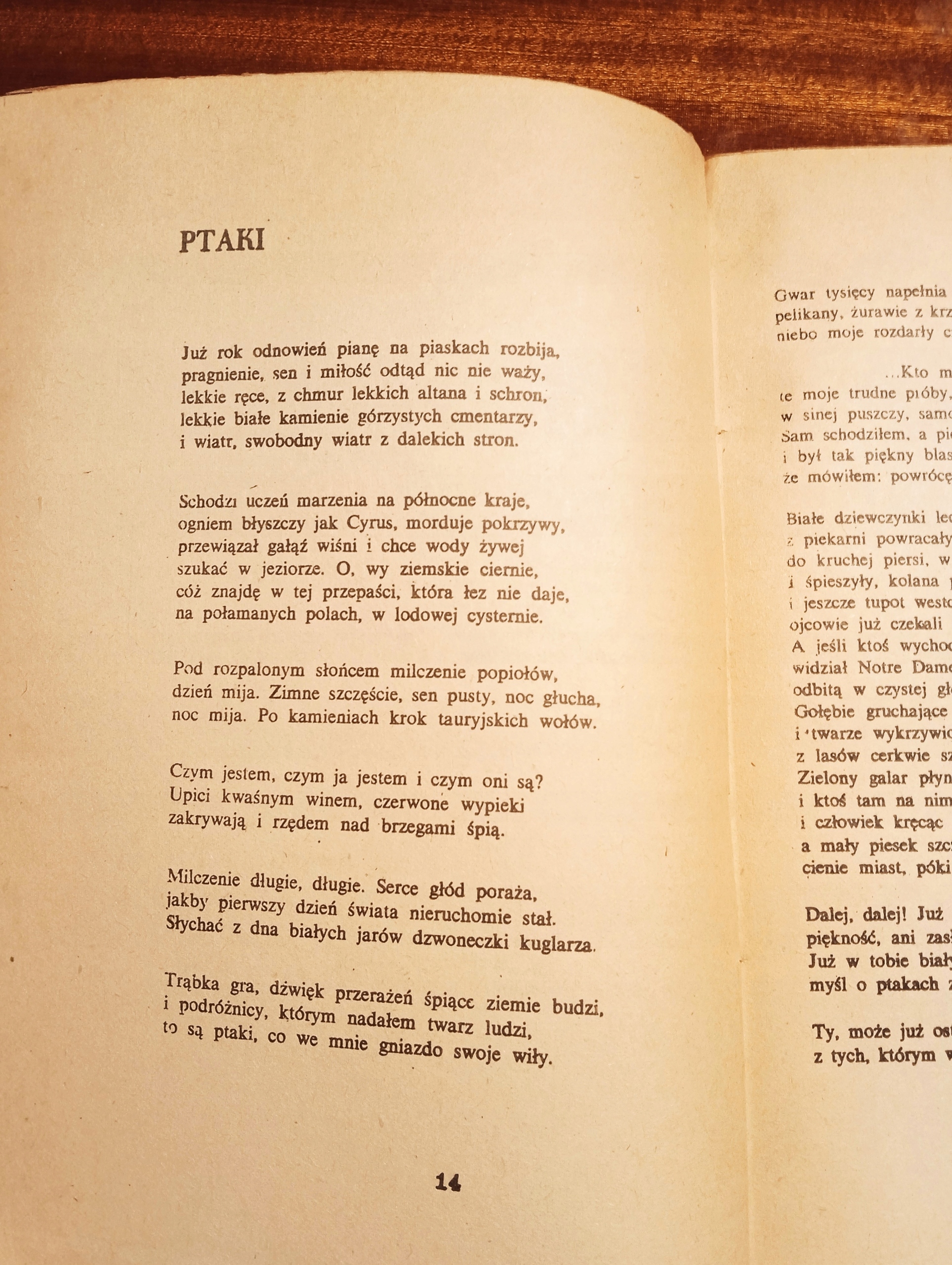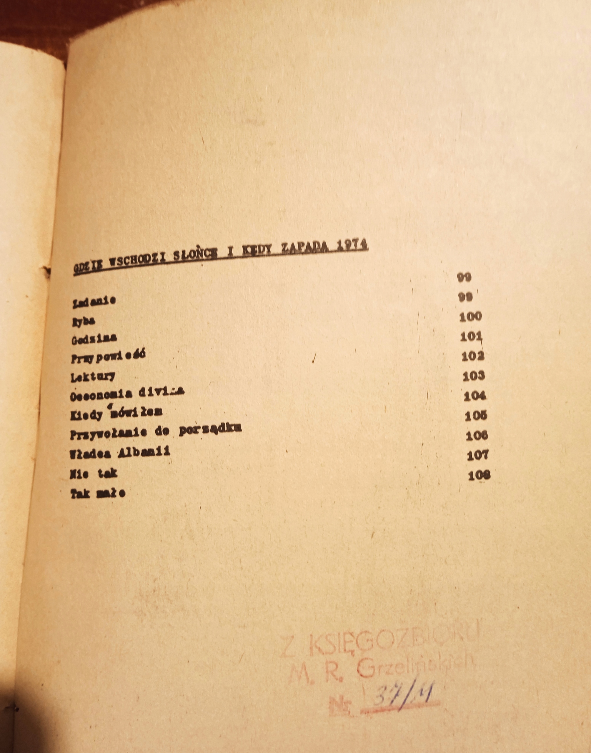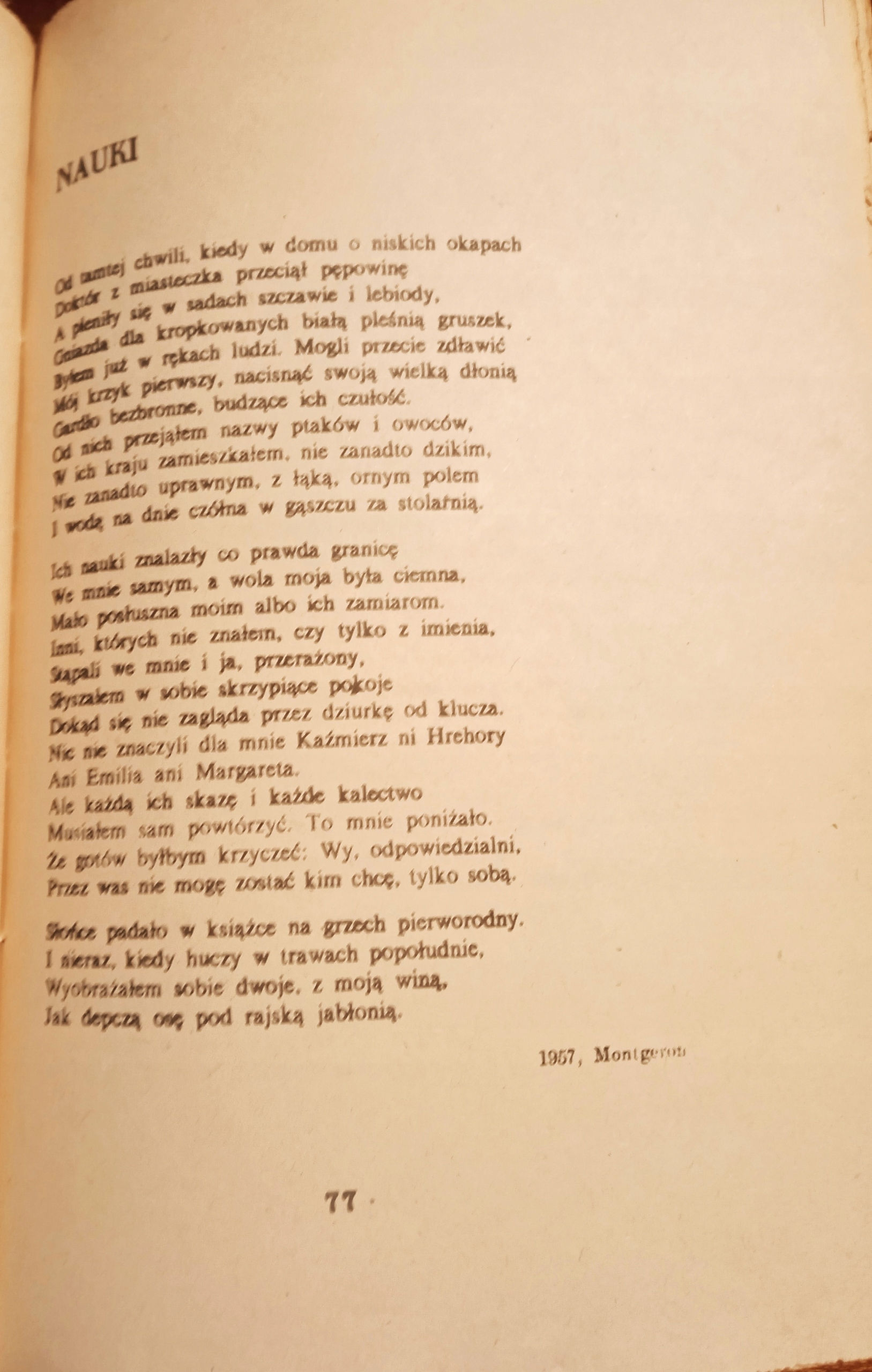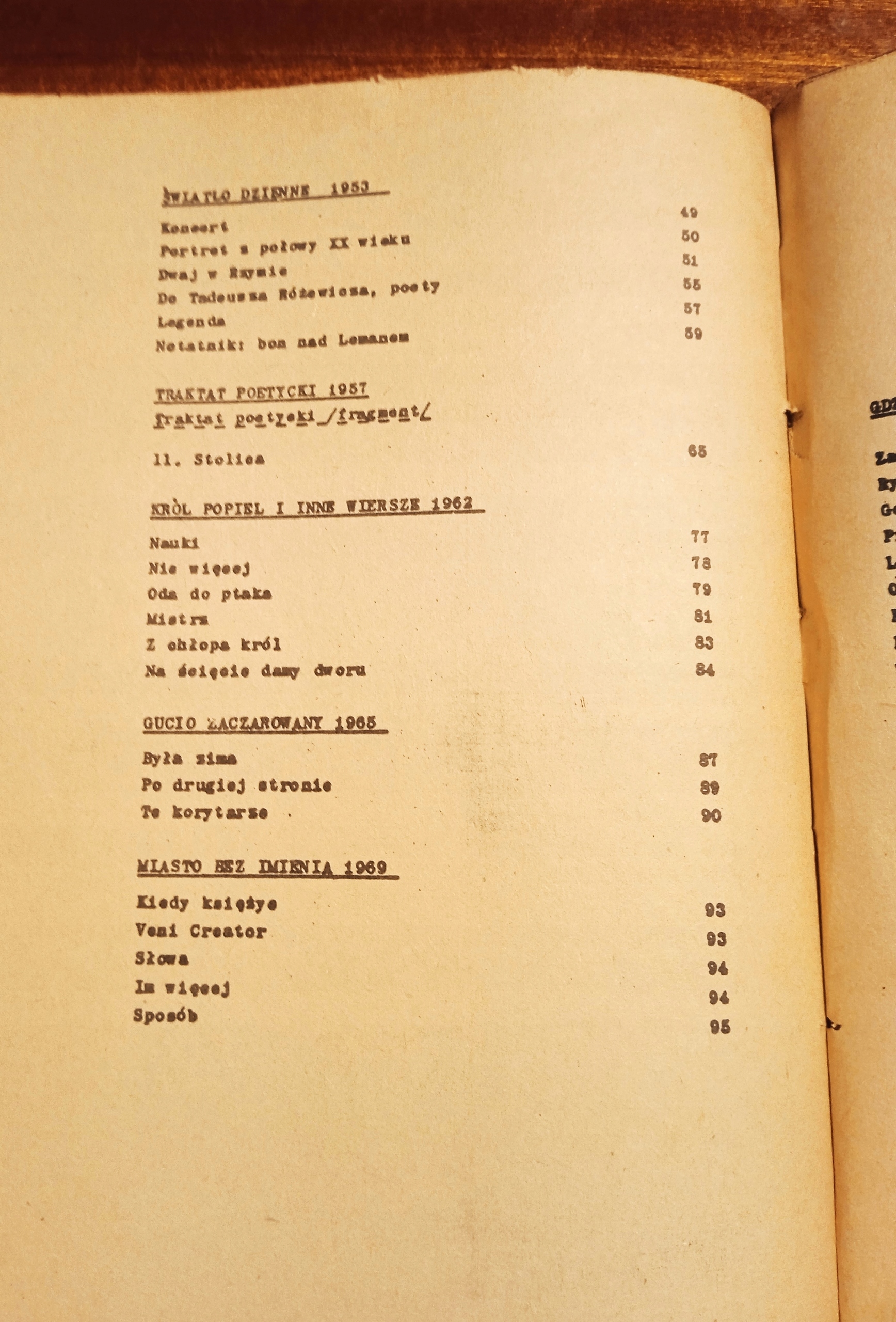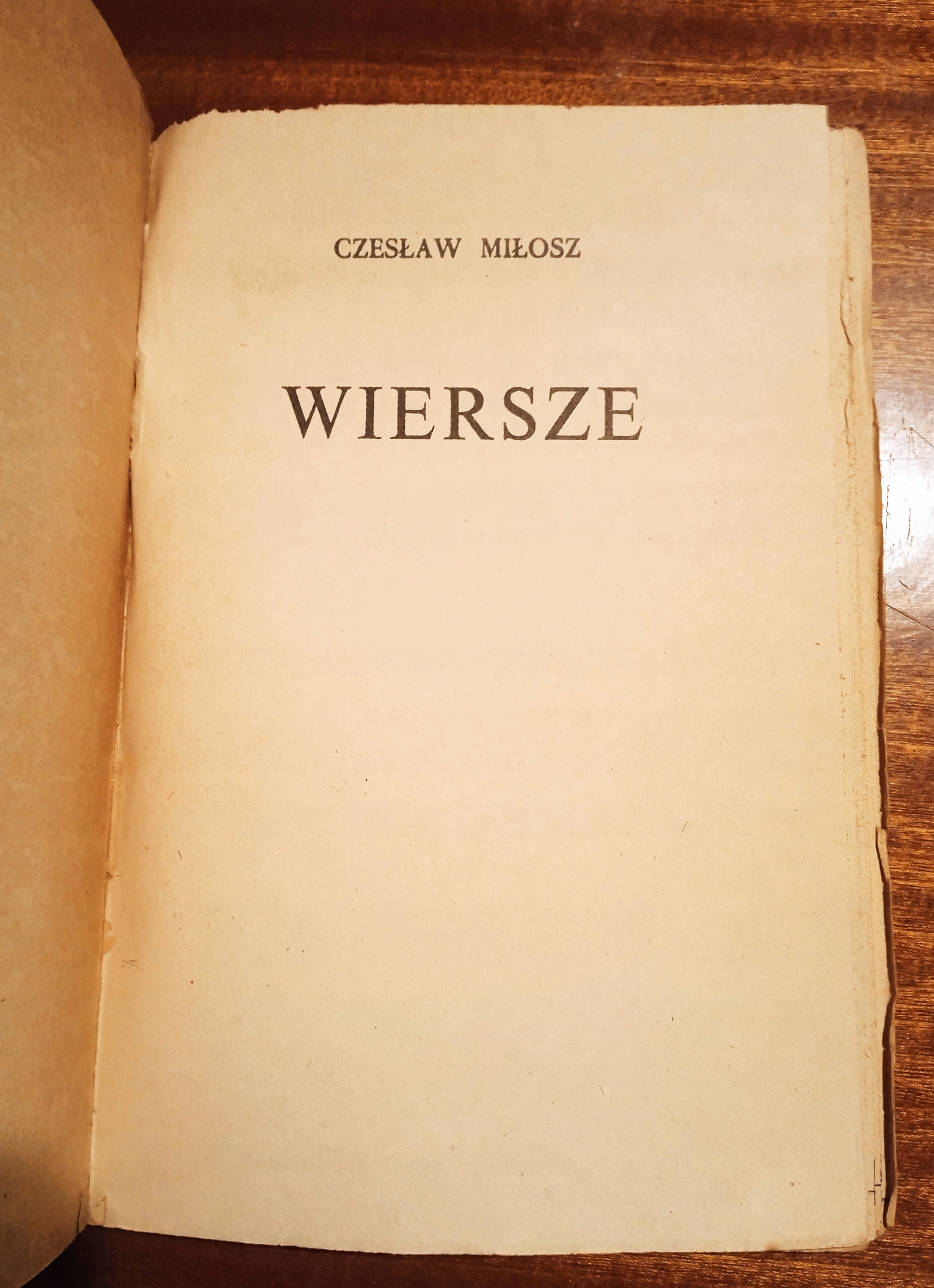 Пропоную на продаж книгу: Czesław Miłosz - Wiersze. Видавництво: Видавництво «Поети». 1980 р. Книга створена в одному з видавництв "Солідарність". Саме цей екземпляр був скопійований у головному офісі Регіону «Солідарність» – Південна Великопольща в Каліші. Сторінки скопійовані, вирізані вручну, розміри нерівні, через що їх краї загнуті. Зміст було написано на звичайній друкарській машинці та скопійовано на мімеографі. Обкладинка брудна, на деяких сторінках штамп із приватної бібліотеки 1960-1980-х років.