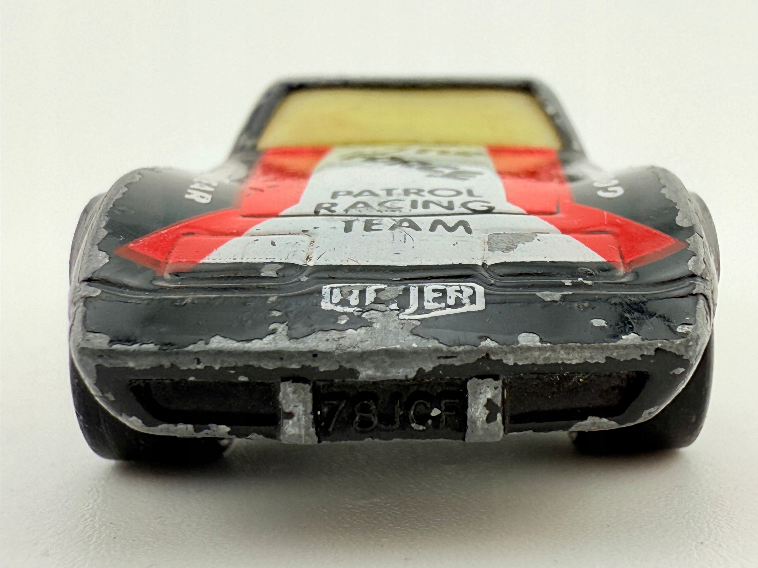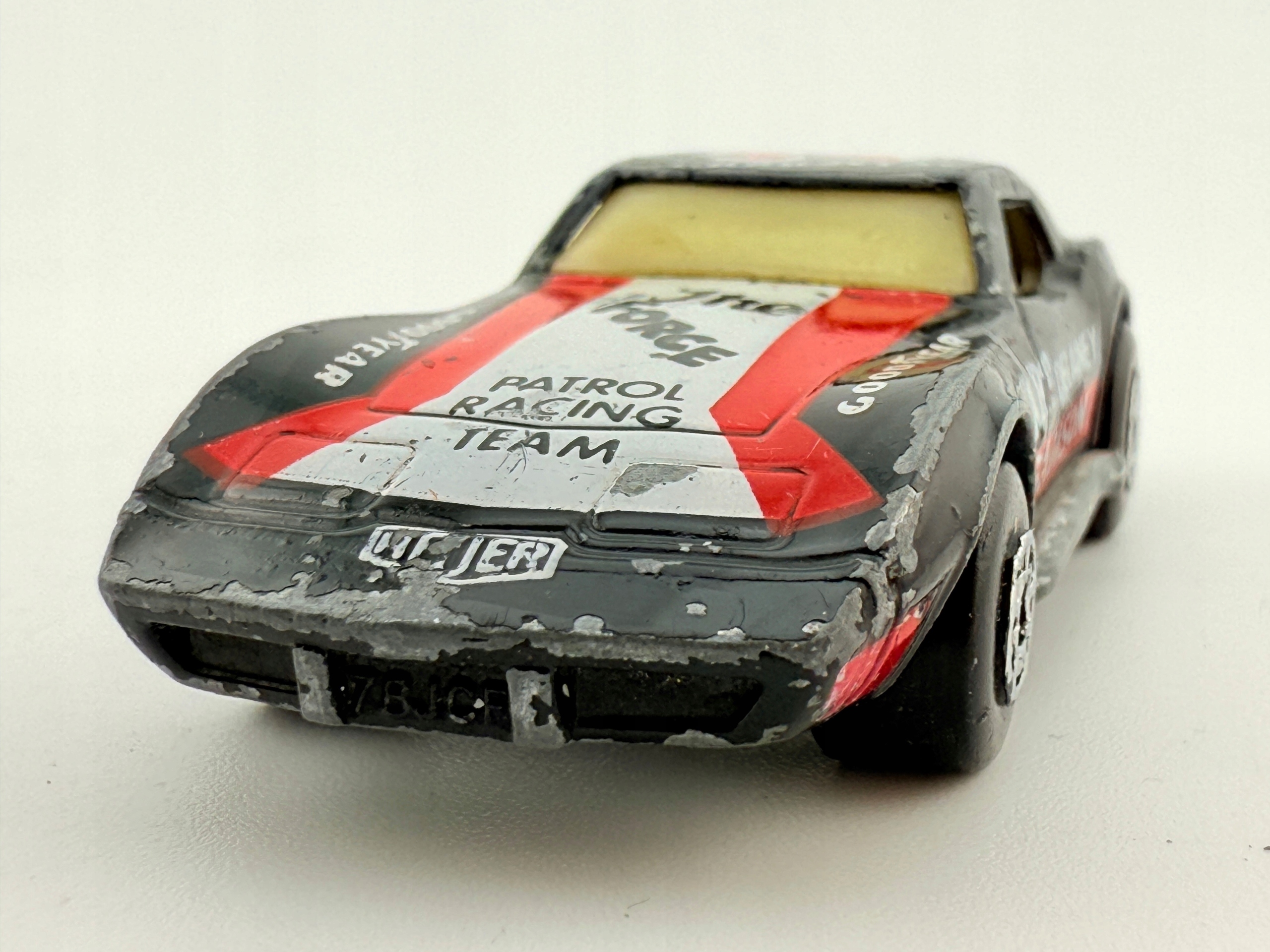 Chevrolet Corvette з Matchbox - це модель, яка привертає увагу своїми гоночними деталями. Зроблений з металу, він має характерний чорний колір з червоними та білими акцентами, які надають йому спортивного характеру. Відбитки на тілі, такі як "Патрульна гоночна команда" та "Добрий рік", підкреслюють його стиль перегонів. Незважаючи на видимі ознаки використання, модель зберігає свою чарівність і може бути цікавим доповненням до колекції. Це весна, яка, безумовно, сподобається любителям гонок та класичних автомобілів.