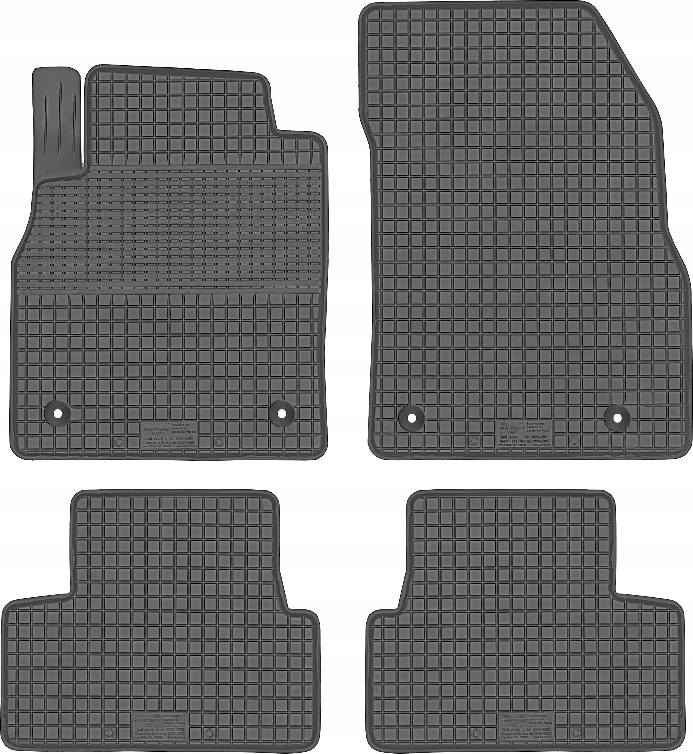 Гумові килимки виробництва MAX-DYWANIK ідеально підходять до моделі автомобіля. Килимки виготовлені з якісної гумової суміші чорного (матового) кольору, яка не виділяє неприємного запаху (килимки мають нейтральний запах гуми). Килимки мають вищий захисний край приблизно 2 см, який призначений для захисту оригінальної оббивки автомобіля від бруду або затоплення. Вся поверхня килимків закріплена невеликими шипами з нижньої сторони, які захищають килимки від руху в автомобілі. На килимках встановлені засувки (стопори), які ідеально підходять до заводських кріплень в автомобілі.