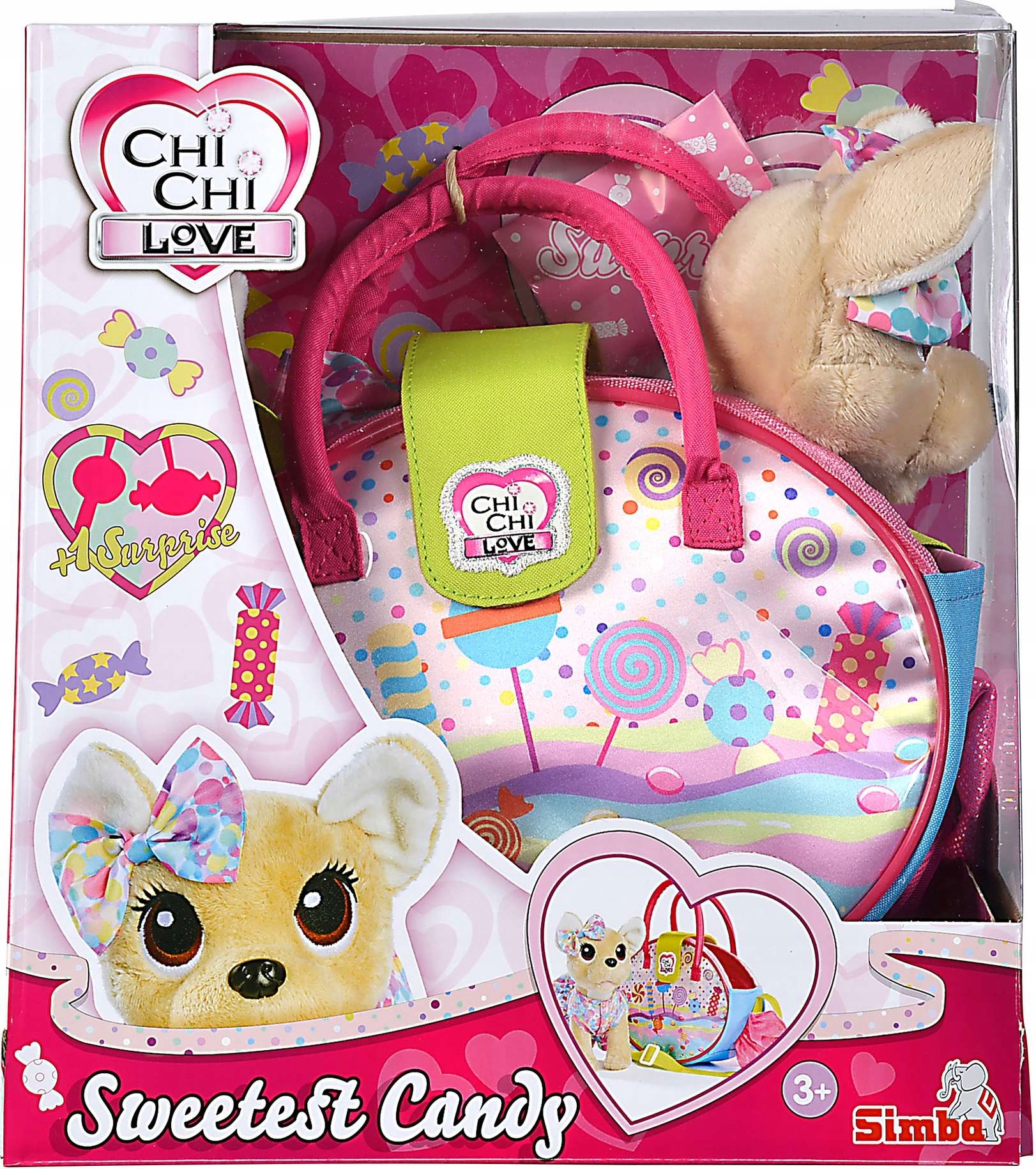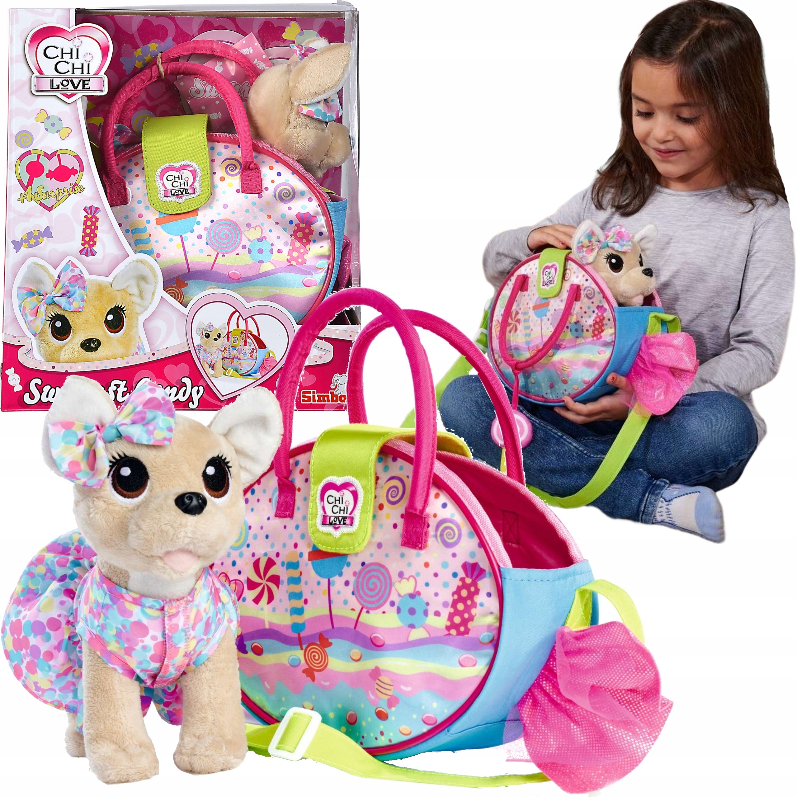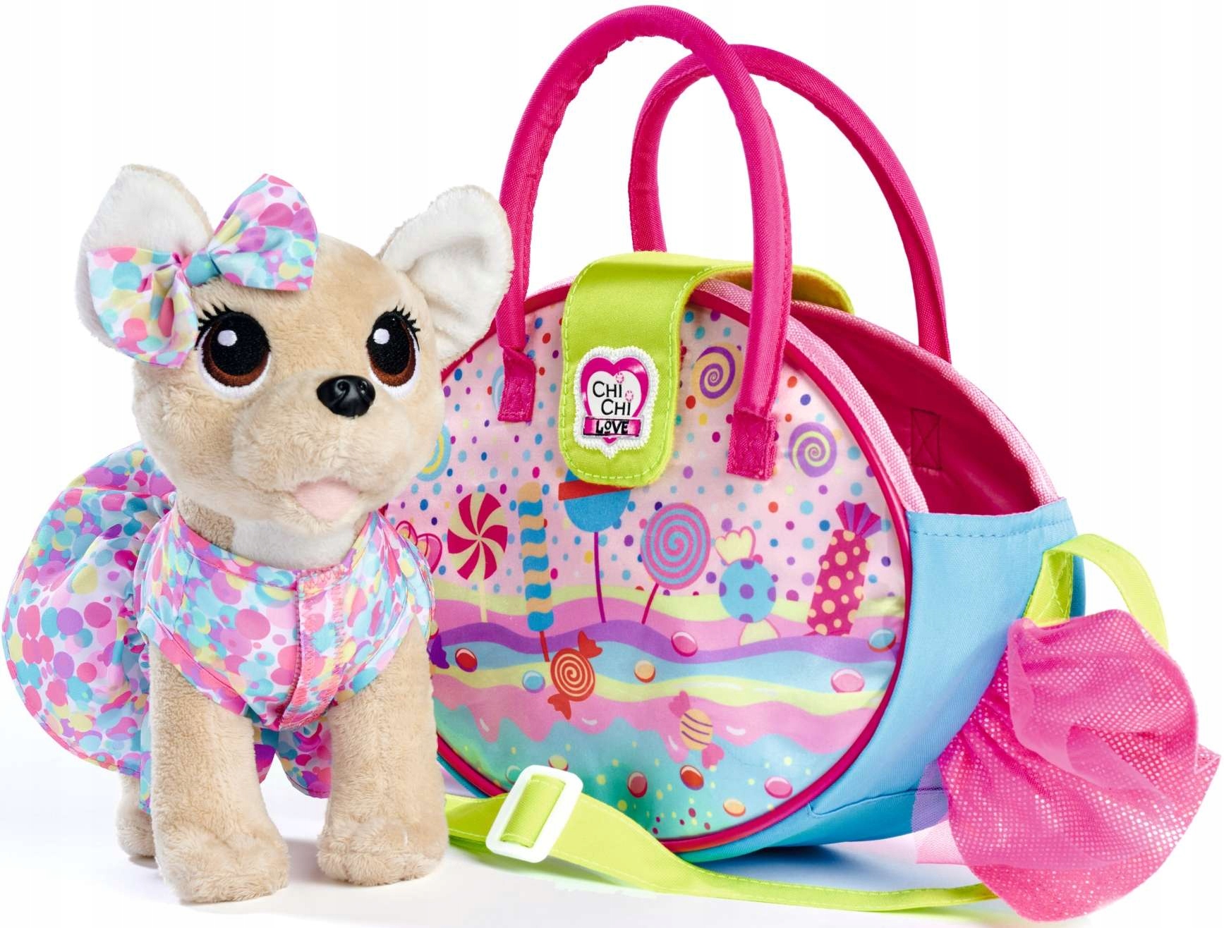 Набір із собачкою Чі Чі включає чудову барвисту сумку із зображеннями цукерок. Дівчата можуть носити собаку Chi Chi або свої улюблені аксесуари в сумочці.