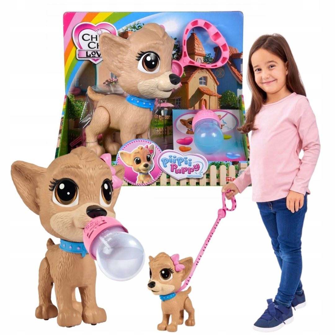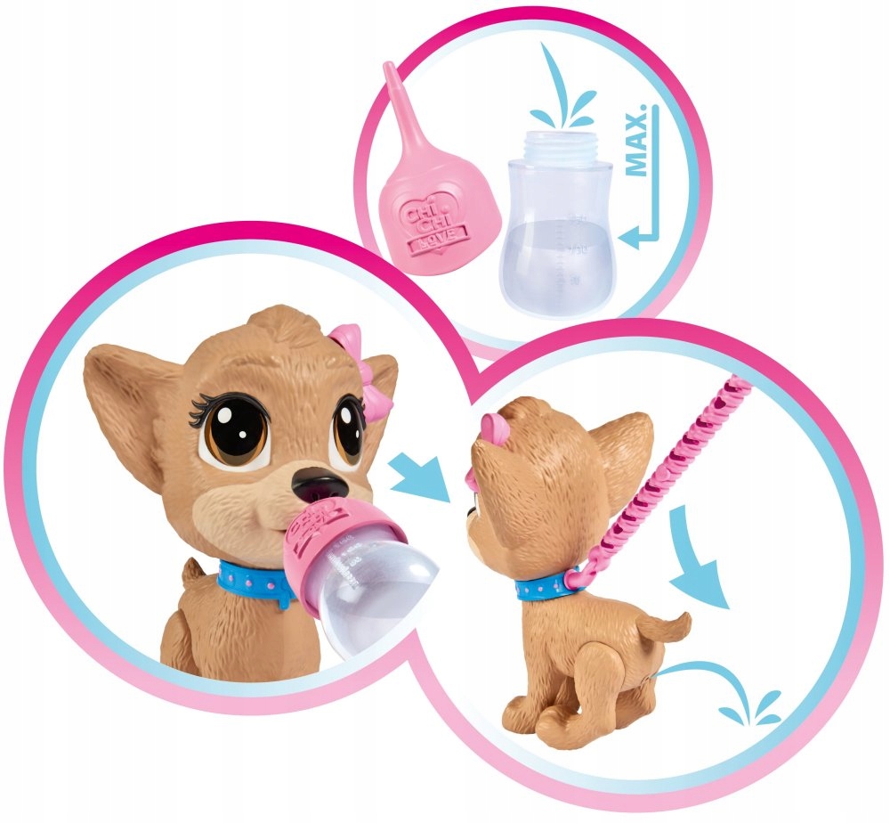 Pii Pii Puppyце мила мультяшна собачкаChi Chi Love, яка може писати. Наповніть пляшку водою (макс. 25 мл), потім напоїть свого спраглого друга. Випивши води, собака буде «пісяти» під час прогулянки. Одягніть поводок і виведіть його на прогулянку. Бо якщо він забрудниться вдома, тобі доведеться за ним прибирати. Цей незвичайний набір неодмінно принесе багато радості дітям, які мріють мати свого улюбленця. А завдяки своїй функції навчить дітей відповідальності та піклування про тварин. Він підготує їх до догляду за справжньою собакою.