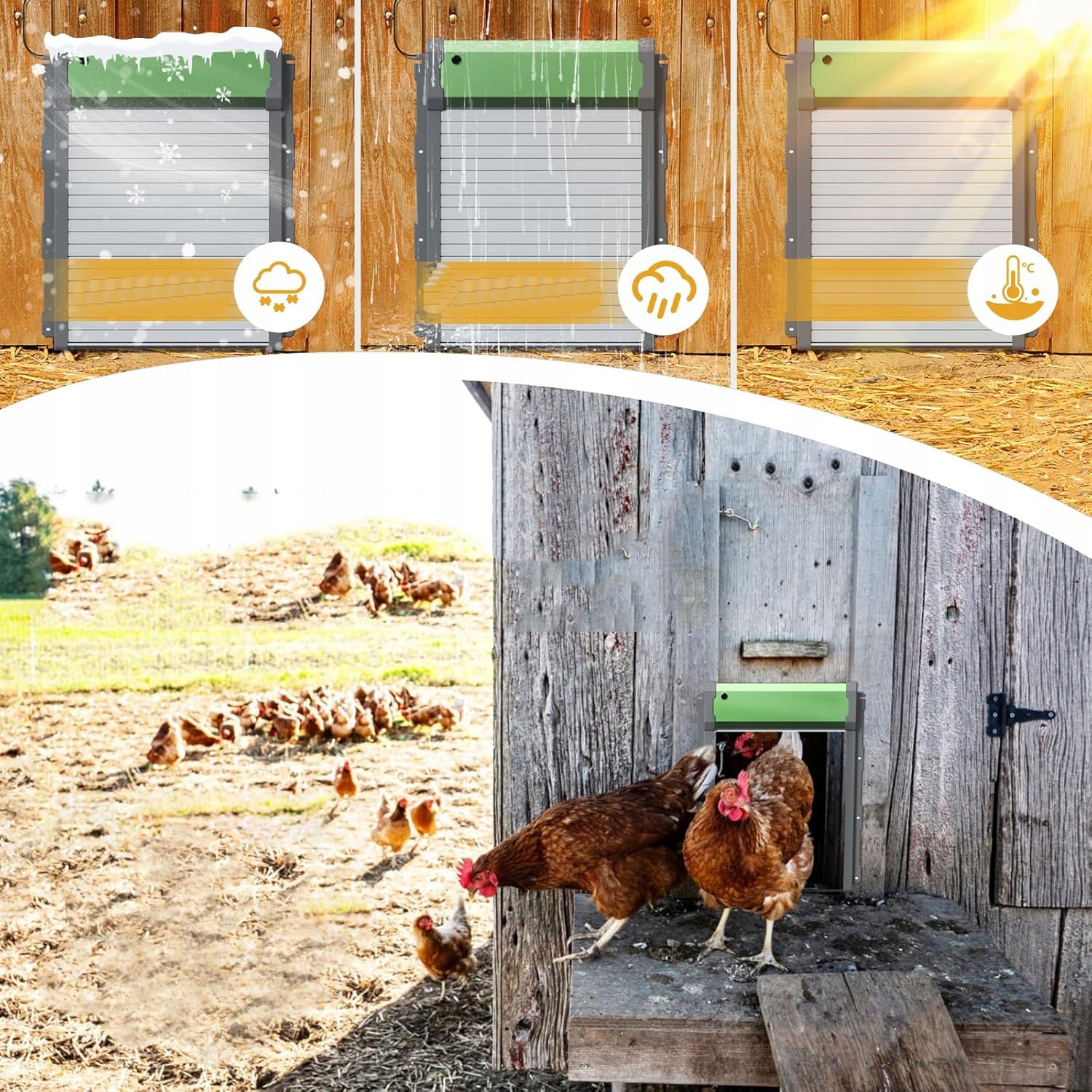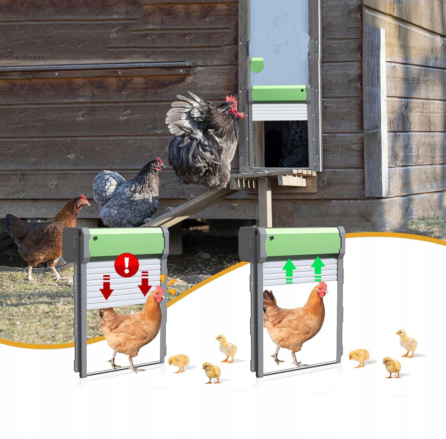 [Дверцята для курятника на сонячних батареях]: автоматичні двері для курятника мають вбудовану батарею на 2000 мАг, яка підтримує зарядку через USB і сонячну енергію. Екологічно чистий і ефективний, одного заряду вистачає на два місяці. Для отримання оптимальної сонячної ефективності встановлюйте панель у місці, де потрапляє пряме сонячне світло.