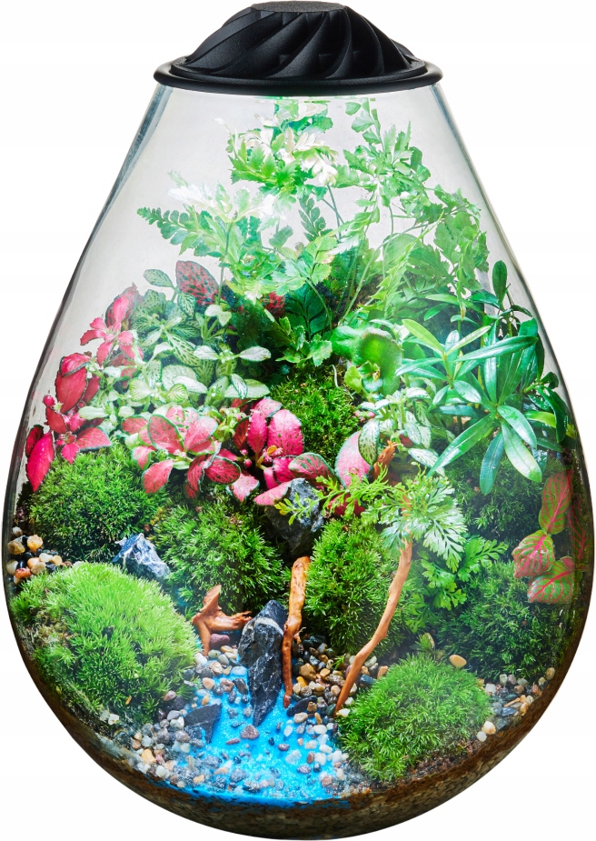 ECO Ping Terrarium Set — невеликий і компактний тераріум для терасового дизайну з якісним освітленням інтегрована в кришку для оптимальних умов росту рослин. Контейнер у формі краплі можна використовувати для створення різноманітних композицій або для вирощування рідкісних і чутливих рослин. Завдяки похилому склу вода та конденсат відводяться прямо на дно.