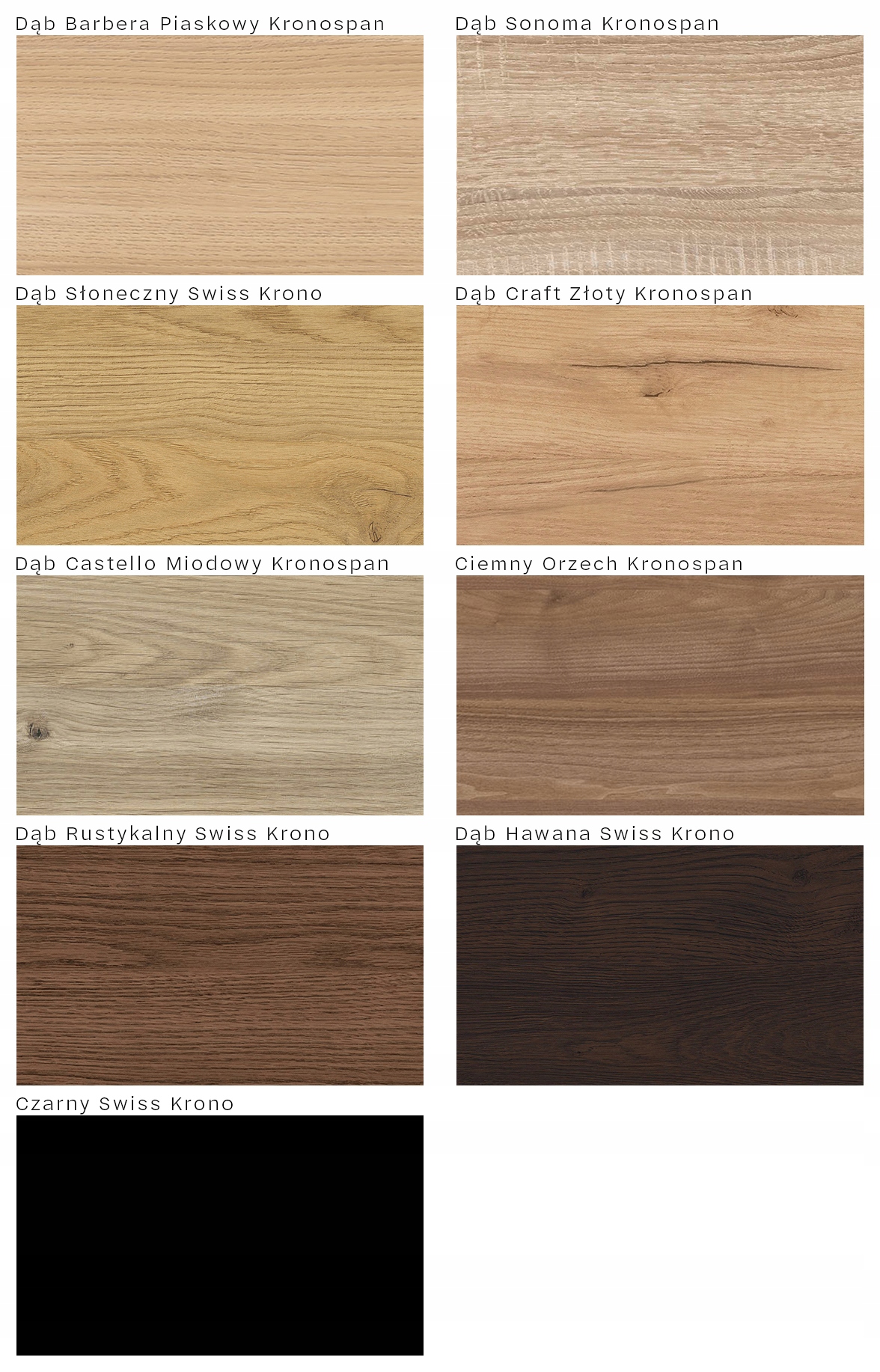 Перший крок - вибрати колір із колекції напівматових ламінованих дощок, представлених на наших графіках. Виробниками ламінованої плити є Egger, Swiss Krono і Kronospan. На нашу думку, вонигарантуютьнайвищу якість меблевих матеріалів, доступних на польському ринку. Ламінована плита від наших виробників має товщину 18 мм і має ряд сертифікатів гігієни та безпеки. Все оздоблено дуже стійким до пошкоджень ПВХ-шпоном товщиною 1 мм. Представлені нами зразки ламінованої дошки є професійними сканами, і їх відображення залежить від налаштувань і калібрування монітора. У разі сумнівів пропонуємо можливість відправити зразки обраних кольорів.