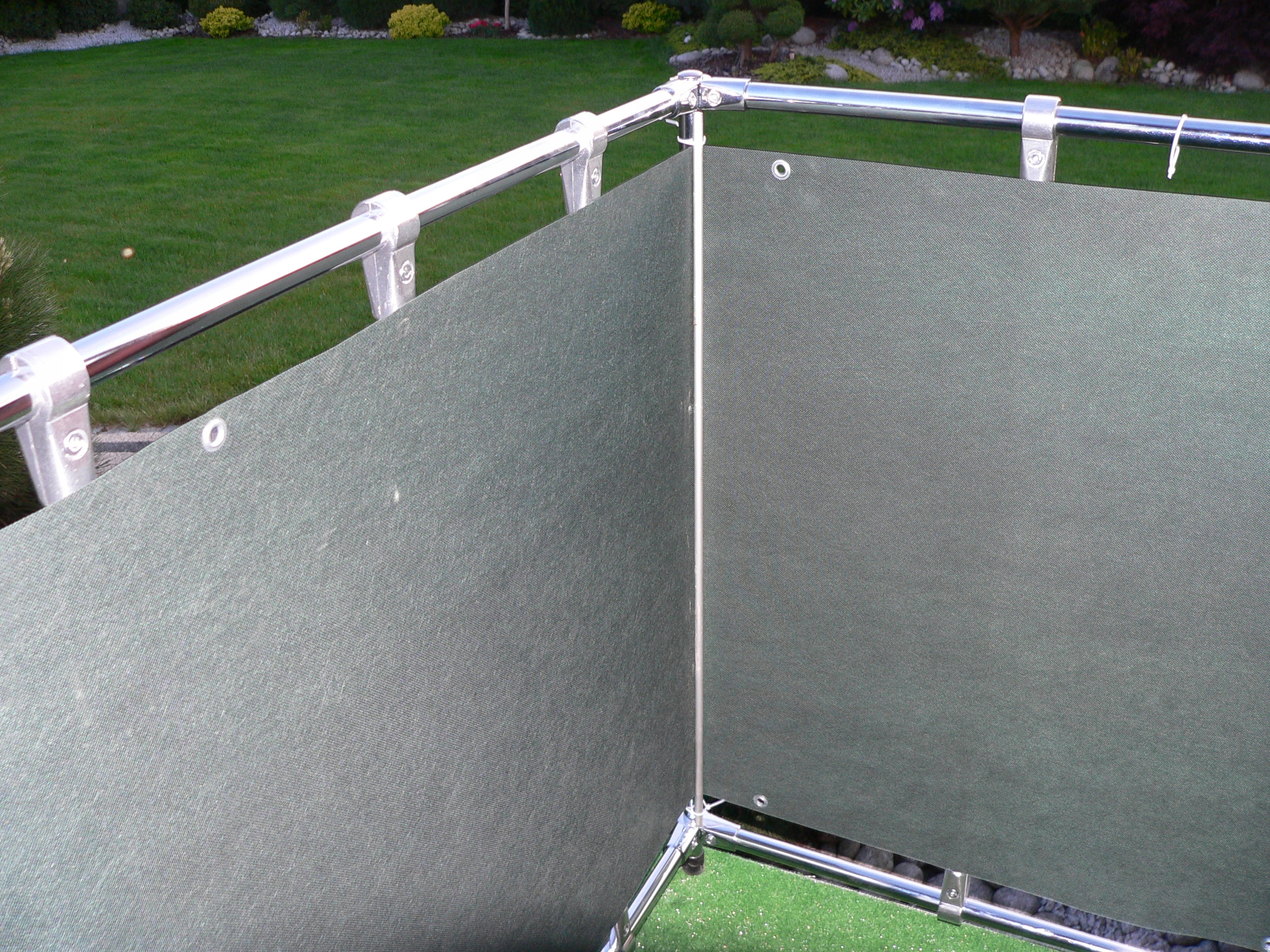 Якщо ми хочемо встановити кришку з внутрішньої сторони балкона і щоб вона була добре натягнута, ми повинні розмістити металевий стрижень у кутах балюстради приблизно на 5 см вище висоти кришки. Потім протягуємо стрижень до стійки затискачами.