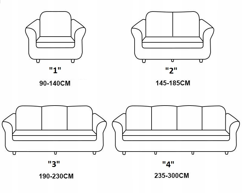 У нашій пропозиції чотири розміри чохлів, які підходять до 90% розмірів дивана. Кожен розмір доступний аж у семи кольорах, тому кожен знайде варіант для себе.