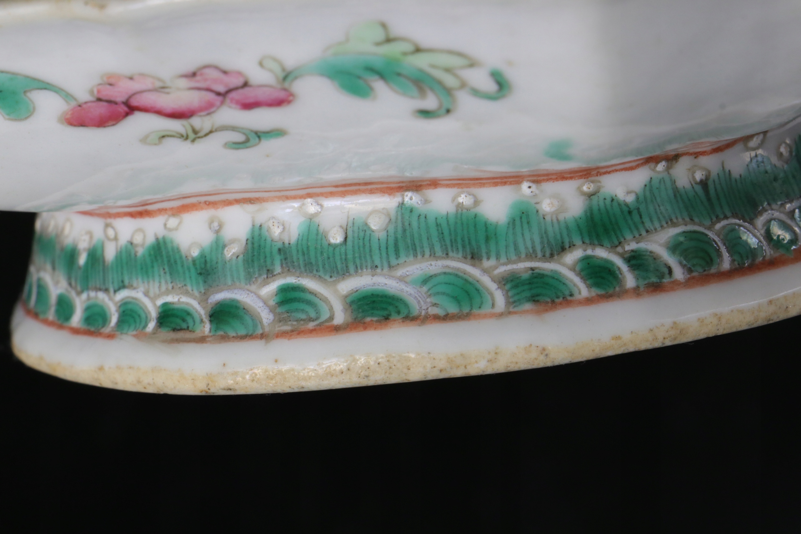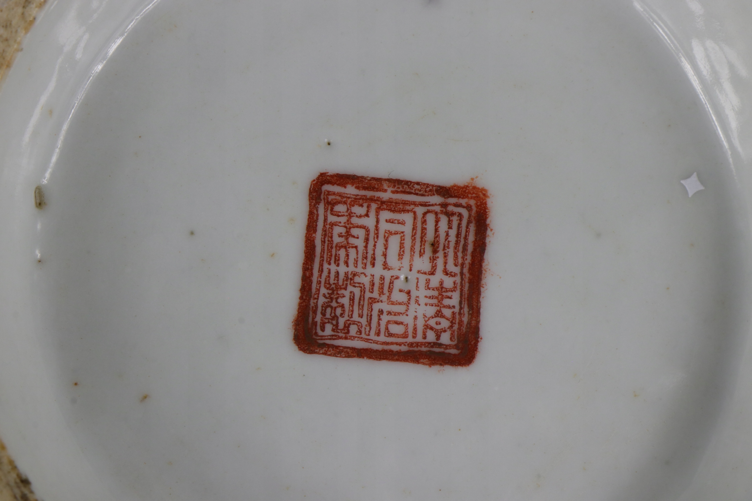 Тарілка з китайського фарфору, розписана вручну густо нанесеними емалевими фарбами. Порцеляна з підписом, марка другої половини 19 ст.