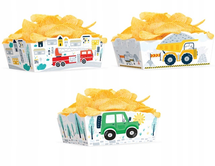 Усі хлопчики люблять машини та будівельну техніку. Коробки з принтом автомобілів обов'язково викличуть посмішку не тільки в день народження... Чіп-бокси - дуже практичний елемент вечіркової колекції Cars. Вони функціонують як миски, в яких також можна подавати фрукти або печиво. Кожна коробка в наборі має різну кольорову графіку та представляє історію двох різних автомобілів.