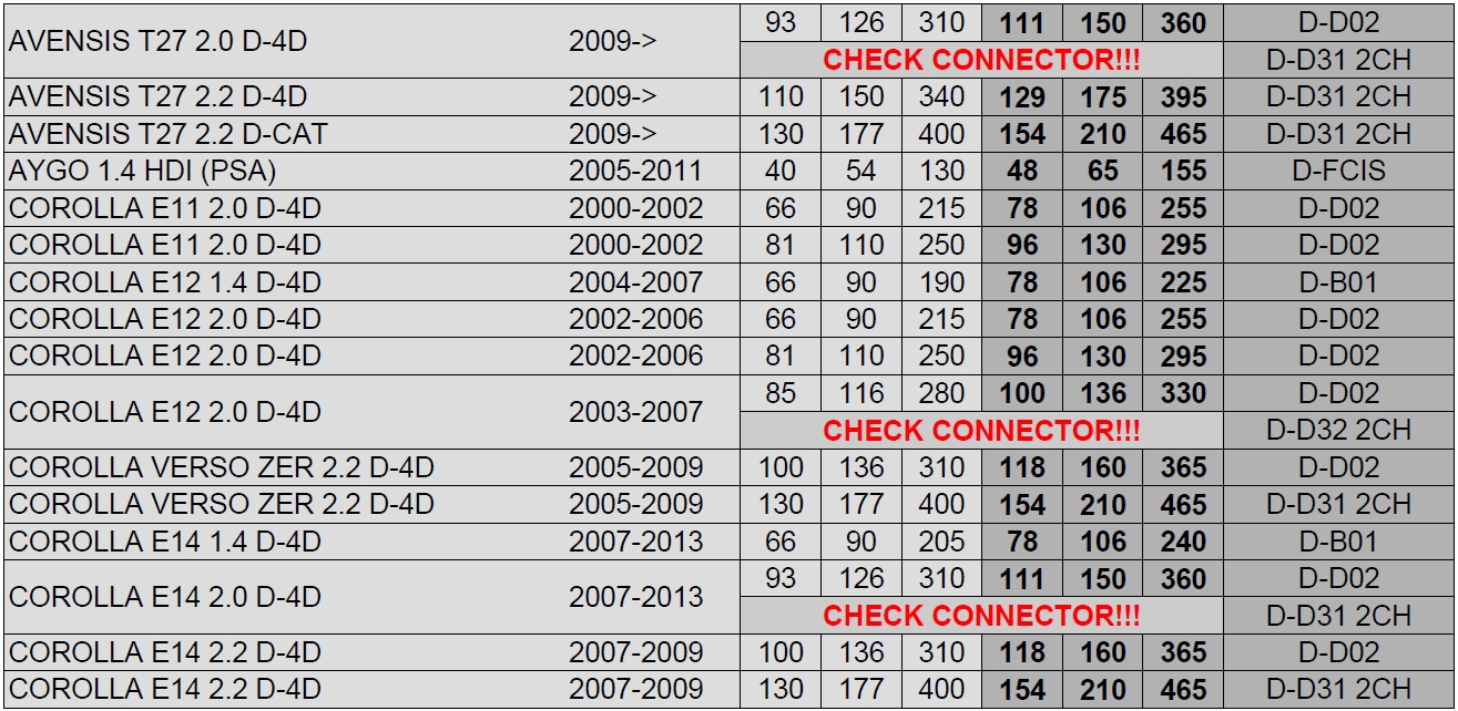 Наведені в таблицях значення приросту потужності та крутного моменту є усередненими і можуть змінюватися в залежності від заводських значень двигуна та його технічного стану.