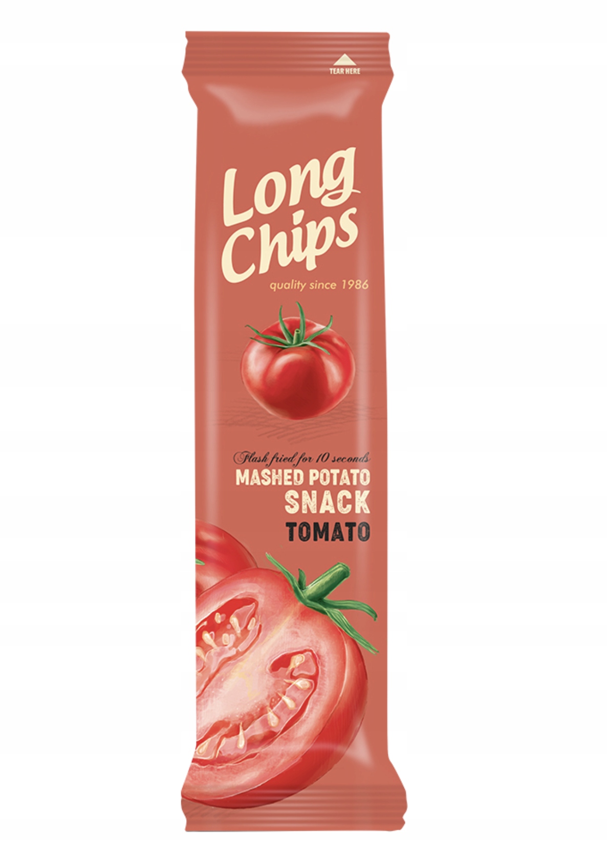 Long Chips Tomato — унікальні картопляні закуски. Вони смажаться на якісній ріпаковій олії всього 10 секунд, що робить їх неймовірно хрусткими і не такими жирними, як класичні чіпси. Лонг Чіпси мають оригінальну форму - вони довгі, плоскі і дуже тонкі. Покладені в лоток, щоб запобігти їх пошкодженню. Вони доступні в ретельно відібраних смаках.