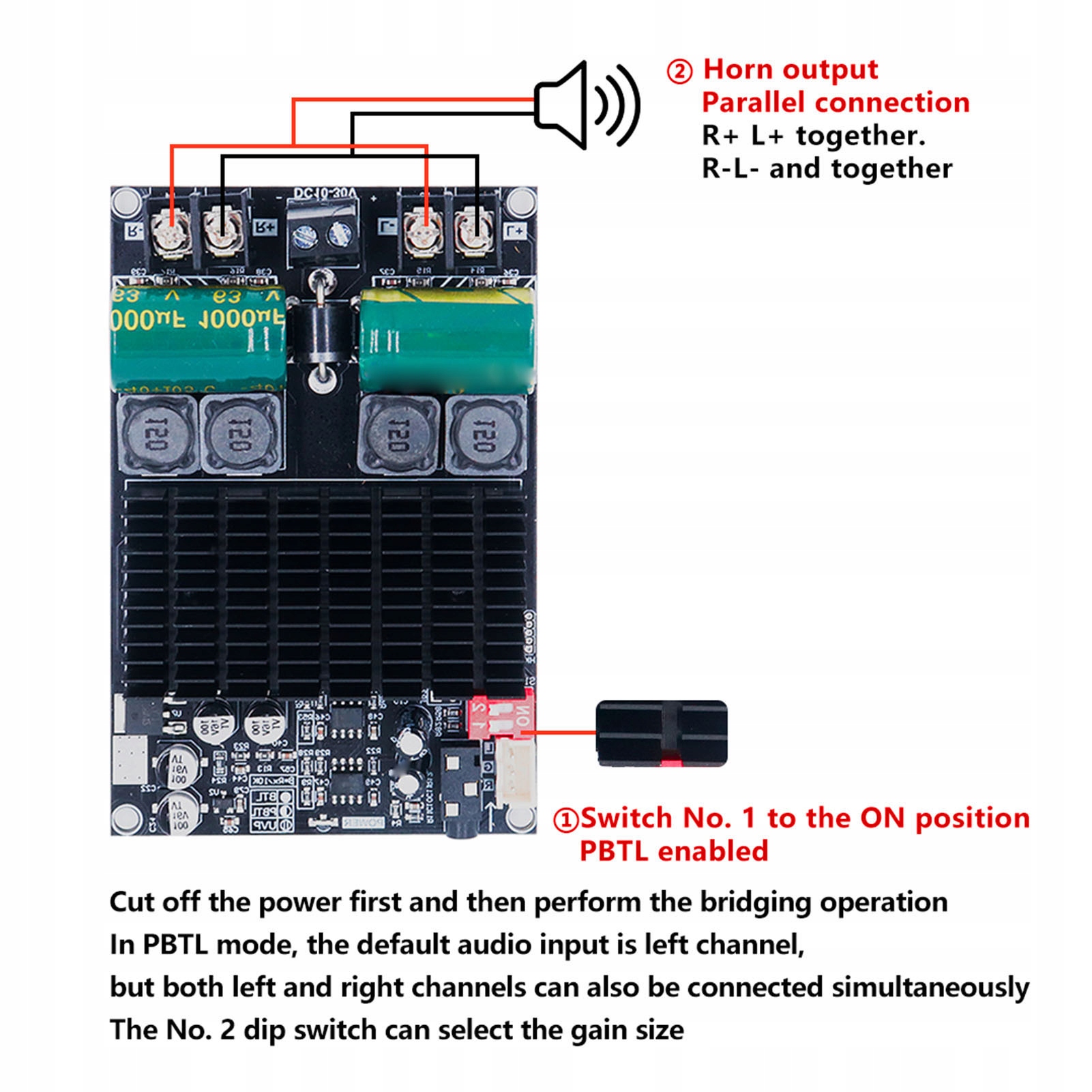 - Конфігурація мосту: Потужність спочатку. Встановіть Pitriver 1 в положення, R+ L+ паралельне вихідний вихід, R-L- Використовуйте рампу