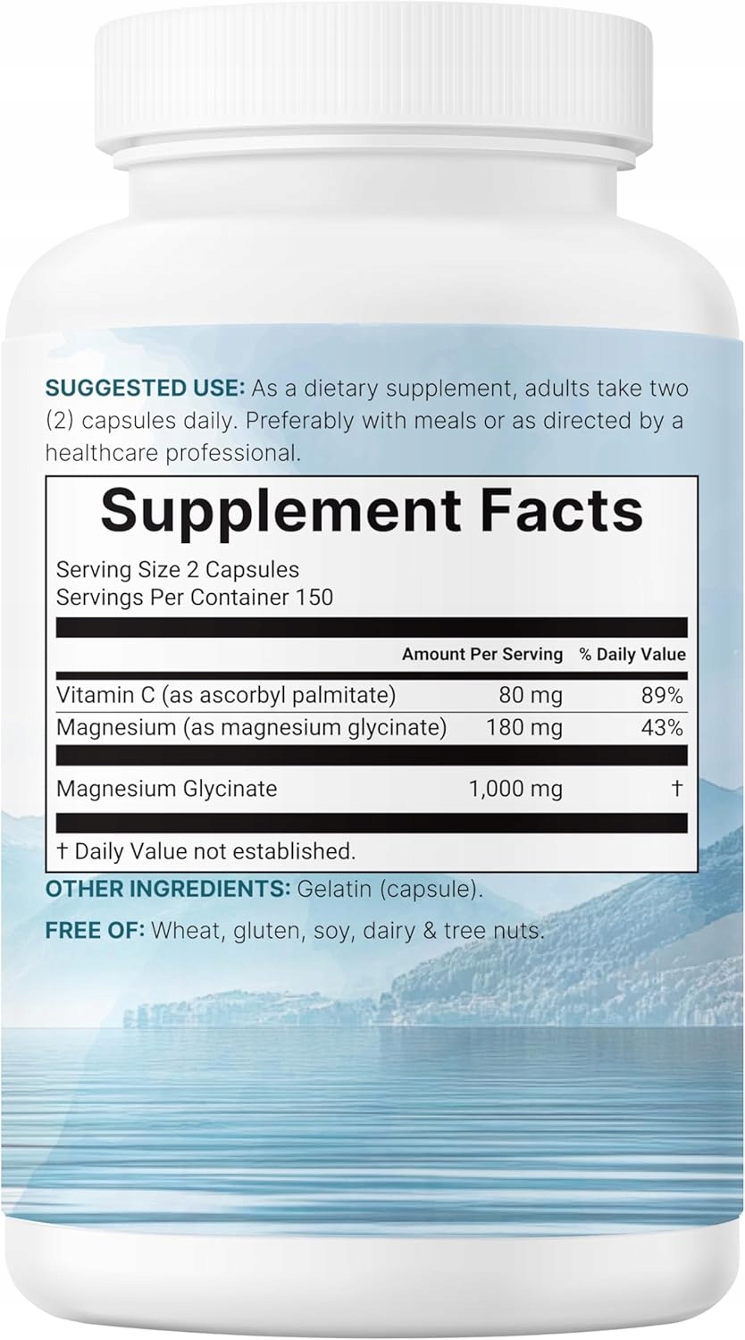 - Кожна пляшка містить 300 капсул, які забезпечують максимальну дозу 1000 мг чистого гліцинату магнію з вітаміном С. Кожна порція з 2 капсул забезпечує 150-денний запас.
