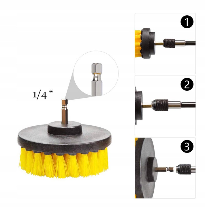 - 🔆 Set of 3 cleaning brushesdesigned for drills and screwdrivers with a standard 1/4'' thread,