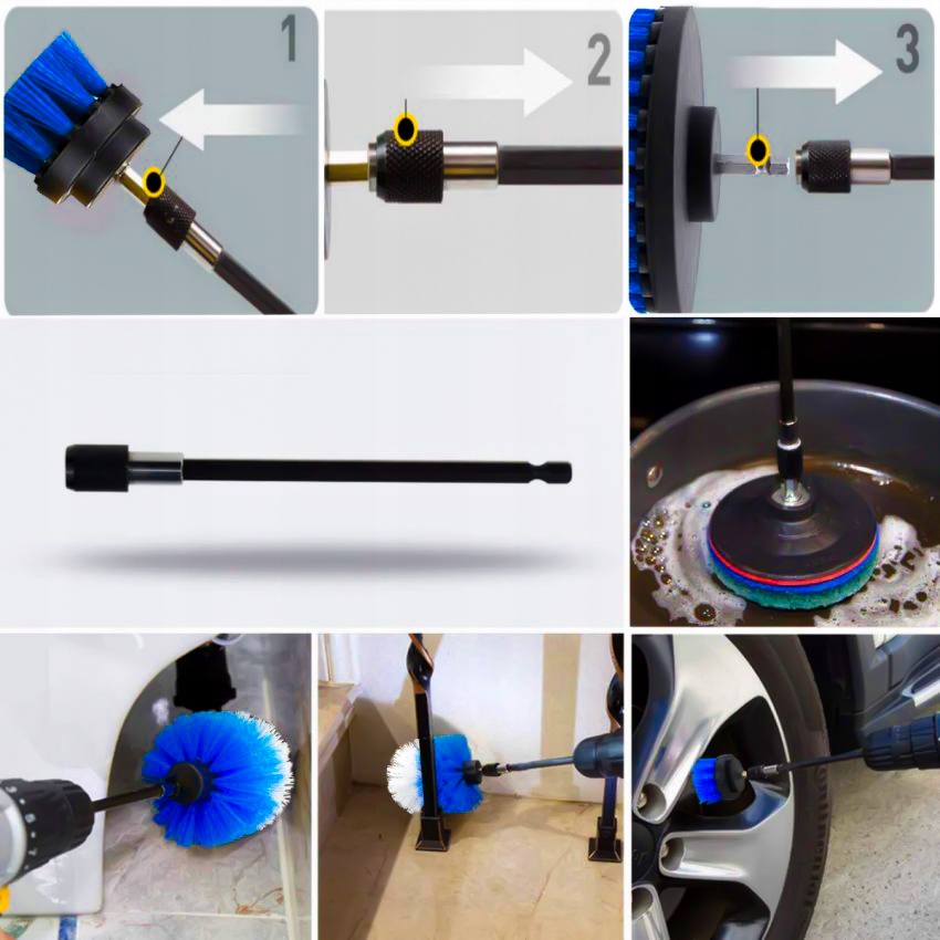 Великий набір дозволить вам пристосувати щітку до відповідних поверхонь і куточків. Насадки 1/4" підходять для більшості дрилів/викруток на ринку.