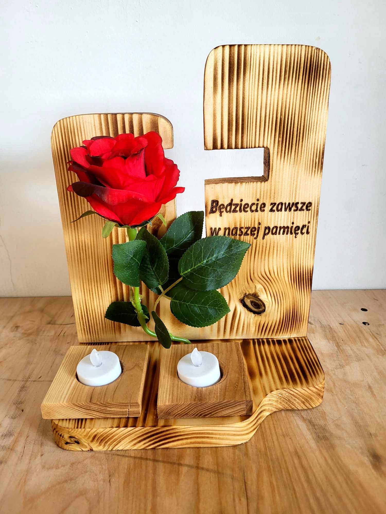 Дерев'яна надгробна композиція з трояндою та вигравіруваними вогнями - це продукт, створений від початку до кінця польським виробником.