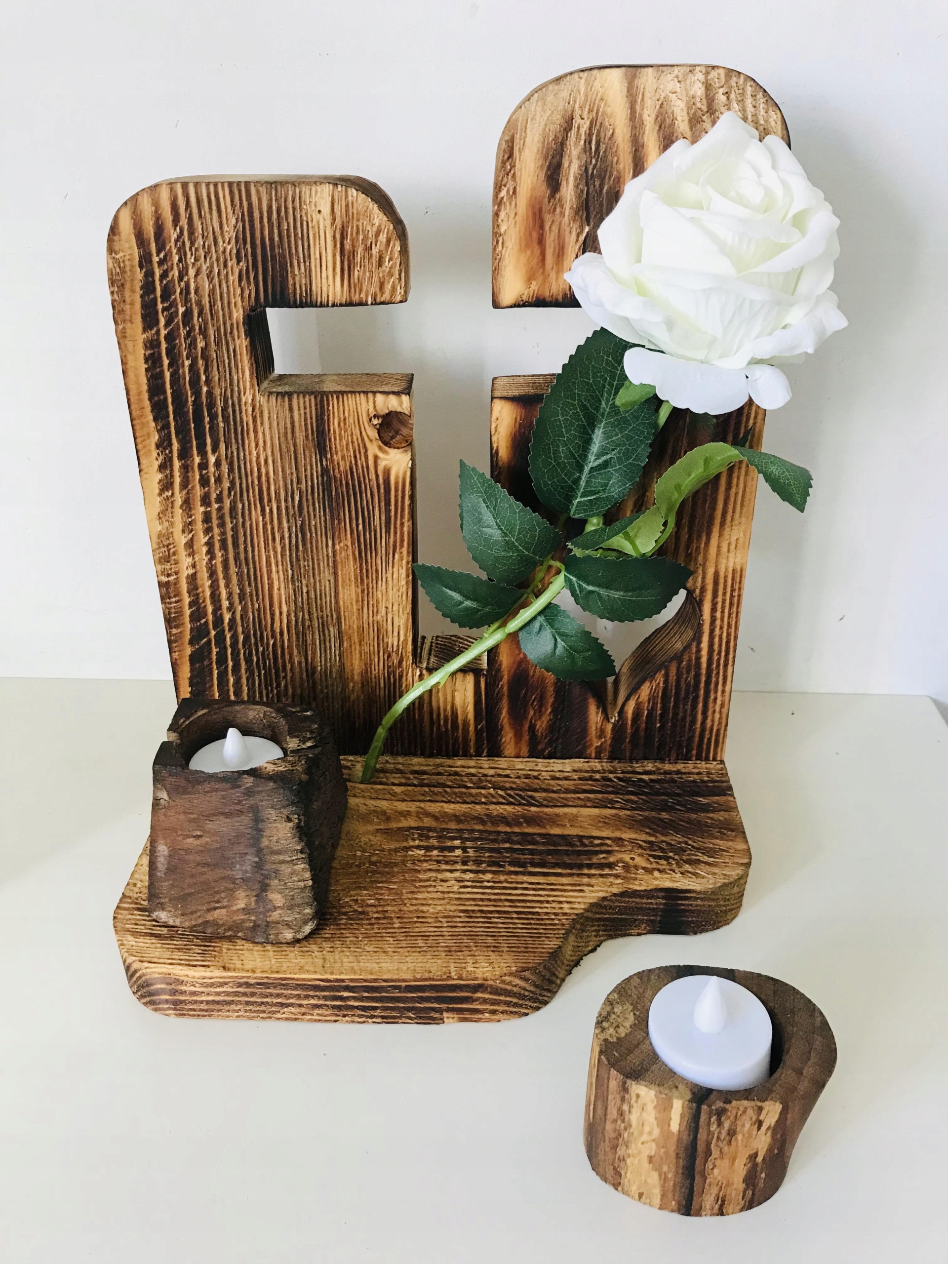 Красиві дерев'яні композиції з дерева з трояндою і вогнями.