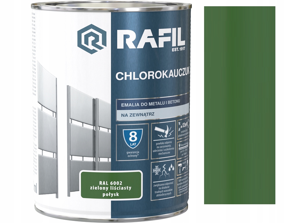 Емаль Хлорокоад rafil у зеленому ral6002 є ідеальним рішенням для декоративного та захисного малювання металів та бетонних зовнішніх будівель. Розроблена для професійних та промислових застосувань, Enamel ідеально підходить для сталевих та чавунних елементів, таких як будівельні конструкції, огорожі, балюстради та механічні пристрої. Він також може бути використаний для декоративного фарбування бетонних поверхонь та цементних пластин, які не піддаються стирання.
