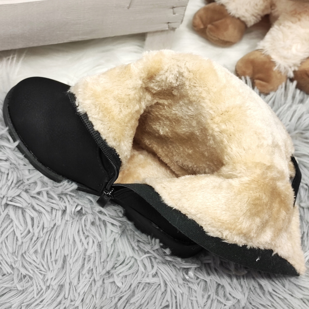 Черевики для дівчинки з м'якого синтетичного матеріалу з декоративним стьобанням верху. М'які та зручні, утеплені густим хутром. Застібка-блискавка полегшує взування, а протиковзка підошва з чітким протектором забезпечує хороше зчеплення з землею. Декоративне хутро і пряжка. Універсальна модель для холодних днів.