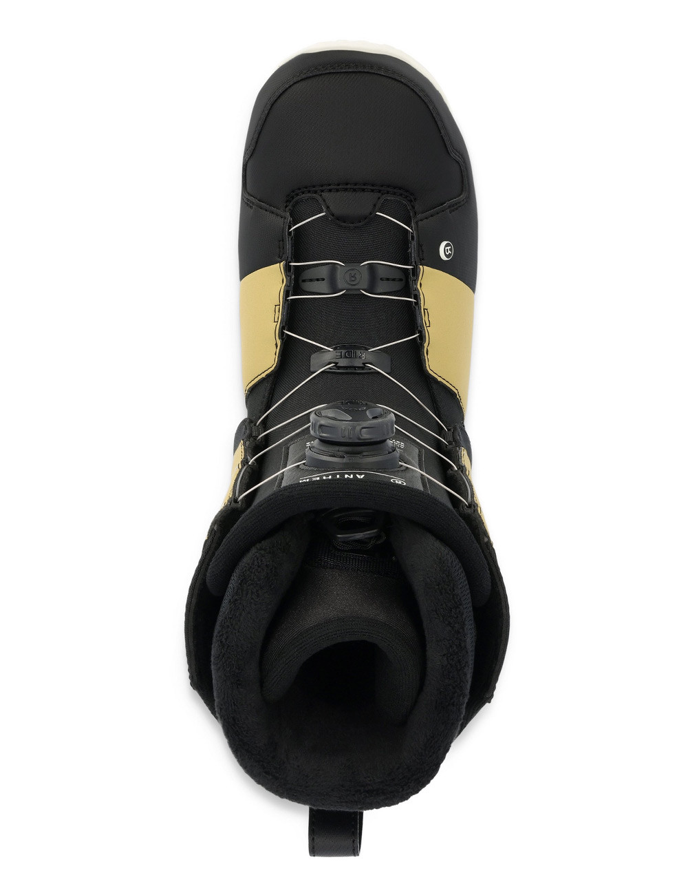 Черевики для сноуборду Ride Anthem мають систему шнурівки Boa H4 Colier, завдяки якій черевики можна точно регулювати. Boa Closer™ Lace Guide пропонує вдвічі більше міцності, щоб надійно закрити ваше взуття. Направляюча лінії Closer™ розташована в центрі передньої частини стопи, щоб зменшити силу шнура та вирівняти натяг шнура по всьому взуттю. У поєднанні з системою Boa це забезпечує рівномірне натягнення шнурків і неймовірно точне кріплення взуття. Lock Down™ Turbo запобігає розв’язуванню шнурівки внутрішнього черевика.
