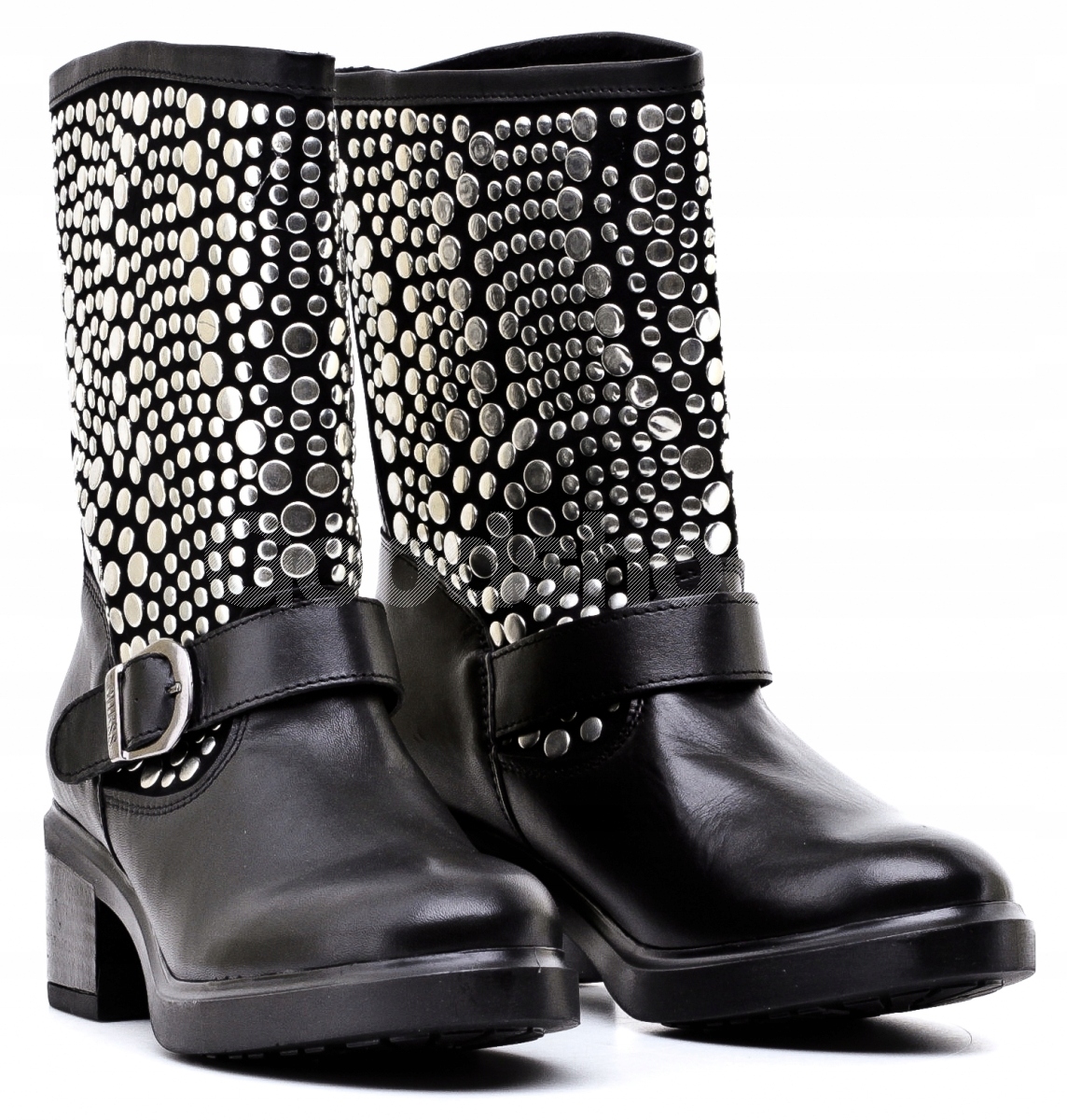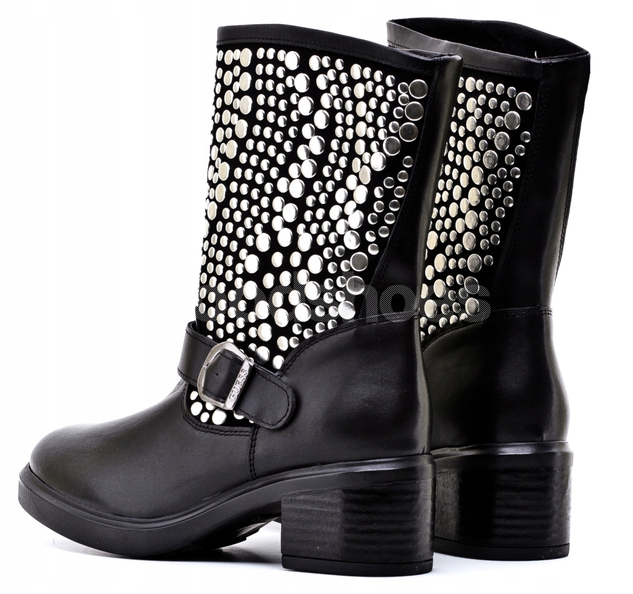 Жіночі чоботи GUESS на низькому каблуці - це модель, яка оригінально і приємно виглядає на нозі. Виготовлений з натуральної зернистої шкіри та чорного матеріалу. Верх чобіт прикрашений сріблястими стразами. Завдяки стійкому блочному каблуку взуття ідеально підходить для повсякденного використання. Вони підходять до спідниць, легінсів і джинсів