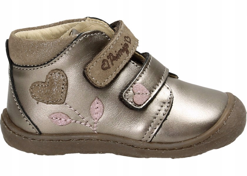 Дитяче взуття Primigi, модель 8408233, коричневе. Верх виконаний з натуральної глянцевої шкіри найвищої якості. Збоку декоративна рожево-коричнева аплікація у вигляді квітки. Внутрішня частина взуття виготовлена з натуральної шкіри, яка забезпечує хорошу вентиляцію та захищає ноги від потертостей. Шкіряна устілка, профільована та дихаюча. Більш жорсткий каблук забезпечує правильну позицію стопи. Пластикова підошва гнучка і не ковзає, сірого кольору. Взуття має зручну систему кріплення на липучках. Це ідеальне взуття для дітей, які починають свої пригоди з прогулянок. Ідеально підходить для холодних днів.