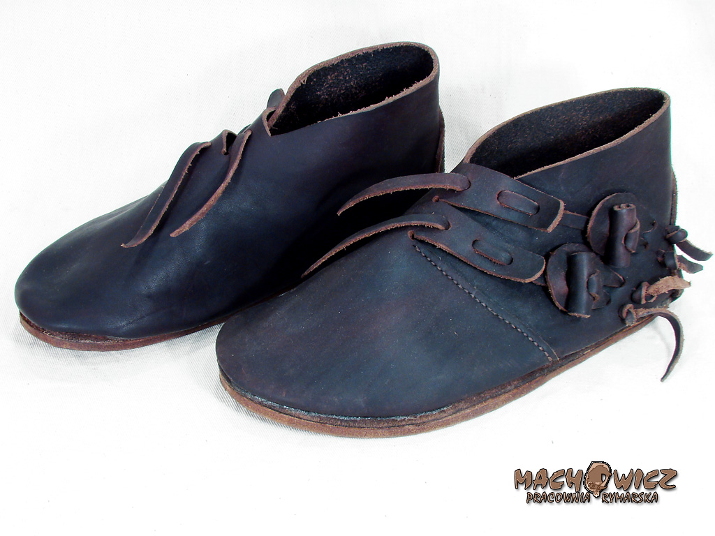 Чоловіче взуття, виготовлене на основі археологічних знахідок з Померанії та Нижньої Сілезії. Виготовлений з товстої букової шкіри з рослинним хромом, приблизно 3 мм. Підошва з товстої задньої шкіри, приблизно 5 мм. Взуття зшита вручну вощеним шпагатом. Зав'язується шкіряним "вузлом" збоку.