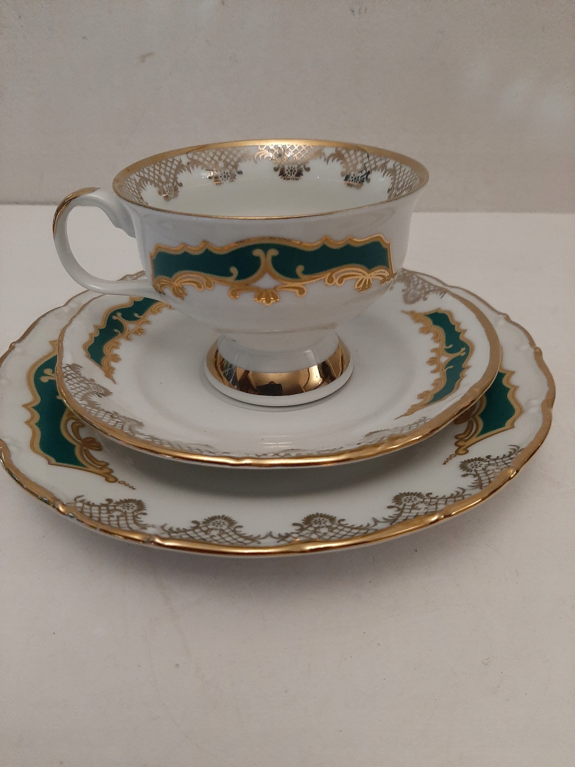 - Дизайн: Набір характеризується багатою позолотою вручну та декоративною бірюзово-зеленою декоративною смугою на білій порцеляні. Форма чашки та тарілок елегантна, з хвилястими позолоченими краями.