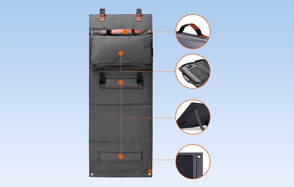 Зарядний пристрій дуже зручний у дорозі завдяки своєму продуманому дизайну та невеликим розмірам - у розкладеному вигляді він становить 948 x 360 x 5 мм, а в складеному вигляді 360 x 195 x 35 мм. Складений зарядний пристрій виглядає як сумка для ноутбука, тому його непомітно.