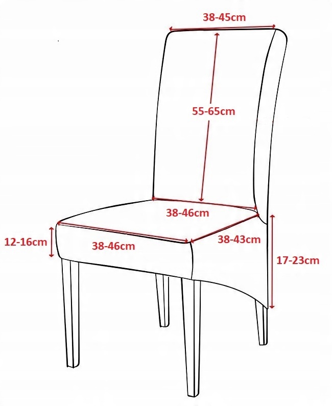 Оскільки чохол розтягується , він найкраще підходить у межах допуску +/- 2 см від вказаного на кресленні. Ми не рекомендуємо стільці більшого розміру, тому що там, де сидіння стикається зі спинкою, може виникнути ефект неприлипання, що означає, що воно не буде виглядати так, ніби воно було зроблено на замовлення.