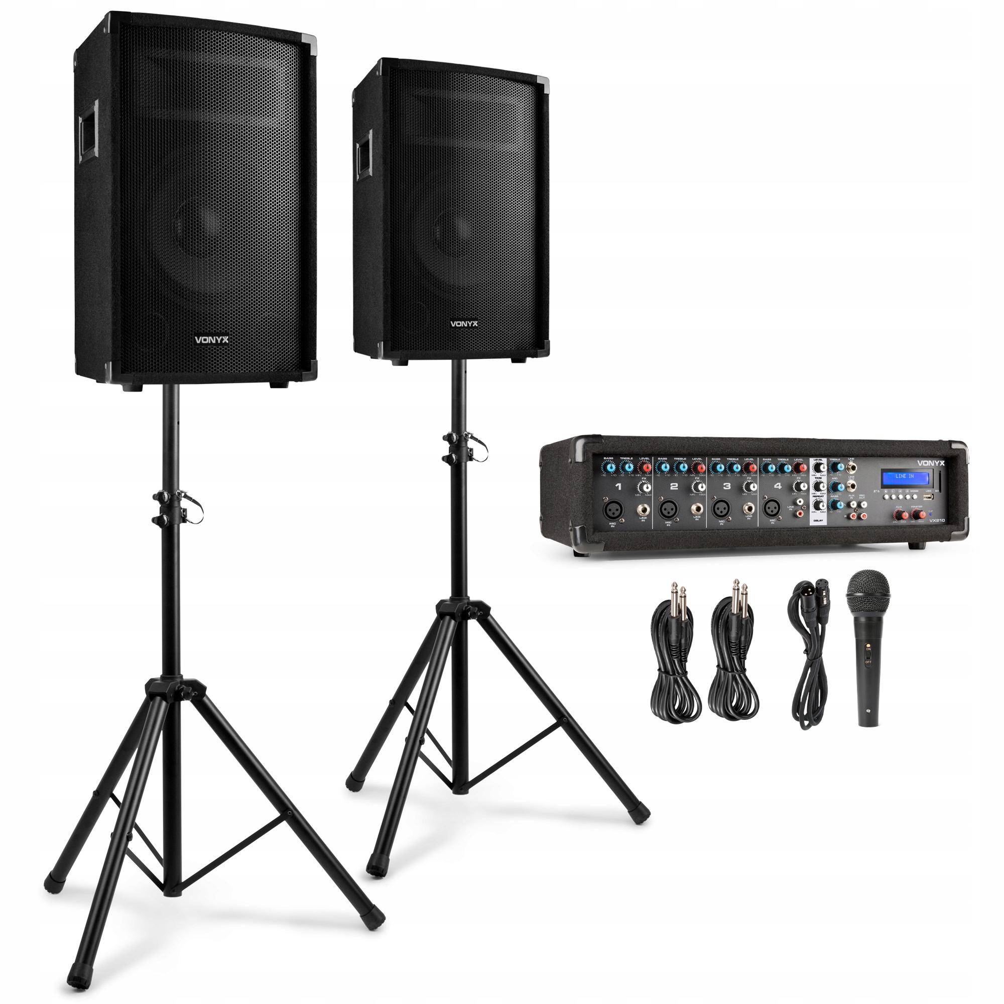 VX210 — це звукова система PA, яка включає 4-канальний мікшер із підсилювачем і медіа-плеєром, два 10-дюймових повнодіапазонних динаміки та всі інші необхідні аксесуари. Система також включає дротовий мікрофон і дві стійки для динаміків, що робить її повноцінною системою plug & play.