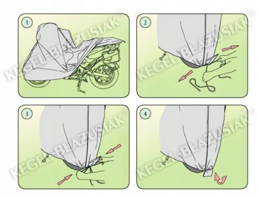 - Одягніть відносно чистий мотоцикл білою стороною центрального ременя всередину і потім якомога міцніше потягніть трос знімача кришки та зав'яжіть його належним чином. Тільки правильна шнурівка гарантує довговічність палітурки. Прив’яжіть мотузку відповідно до інструкцій, і ви будете впевнені, що кришка закріплена надовго та міцно, а отже, що ваш автомобіль у повній безпеці. Рекомендоване зав’язування дозволить міцно з’єднати два кінці мотузки та водночас дозволить швидко розв’язати її призначений для використання лише на припаркованому транспортному засобі - його не можна використовувати під час транспортування автомобіля, наприклад, на евакуаторі.