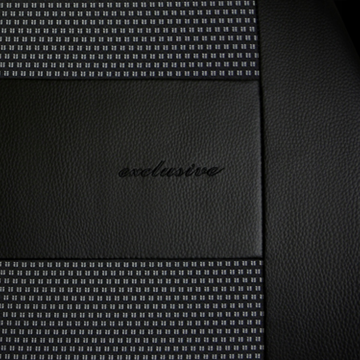 АвточохлиEXCLUSIVE виготовлені з високоякісної штучної шкіри та найякісніших оббивних тканин в центральній частині чохлів. Поєднання цих матеріалів забезпечує ексклюзивний зовнішній вигляд і виняткову довговічність виробу, а також чудовий захист сидінь від бруду та стирання.