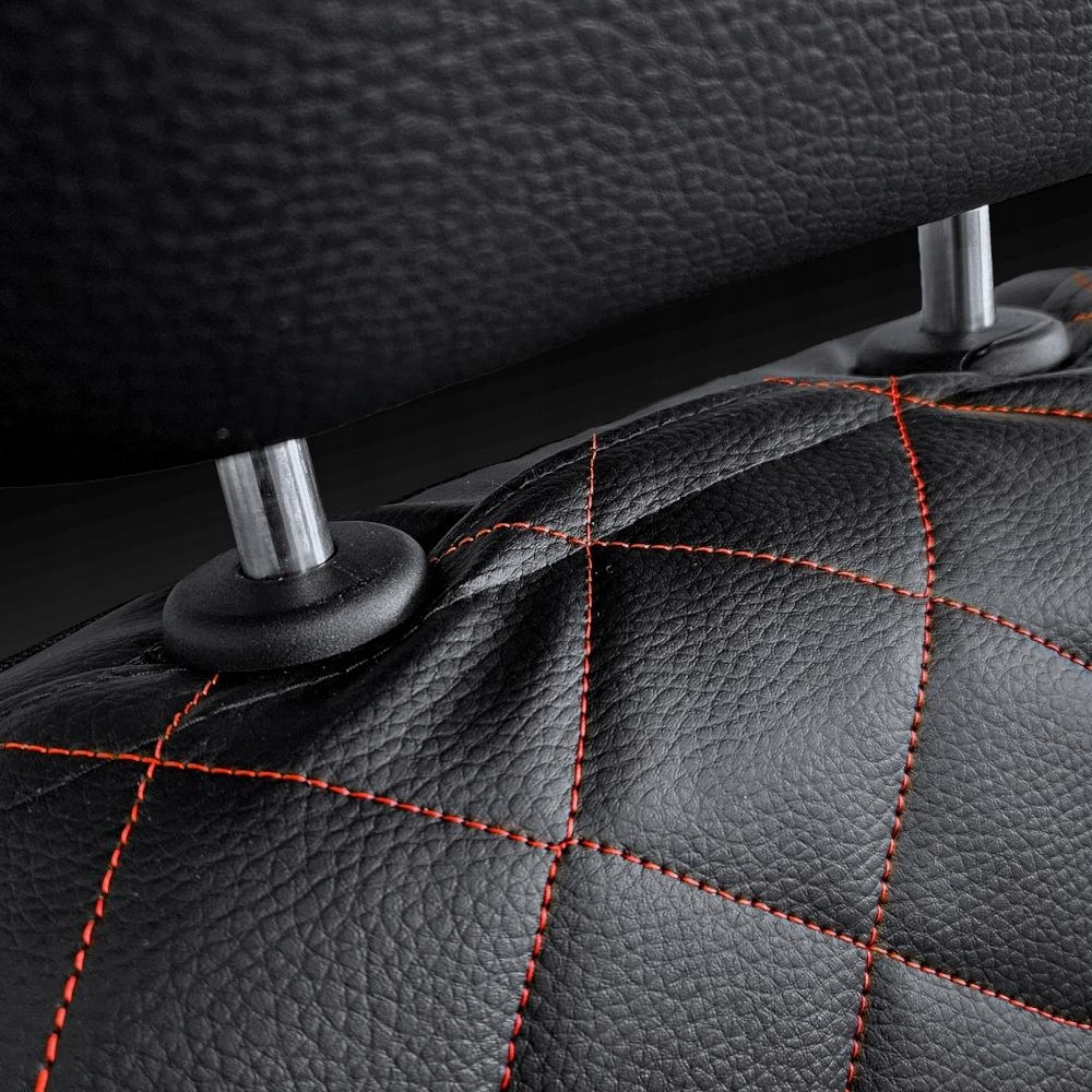 Чохли PERFECT LINE виготовлені з високоякісної штучної шкіри чорного кольору, яка посередині має елегантне ромбовидне стьобання, отримане за допомогою кольорової нитки.