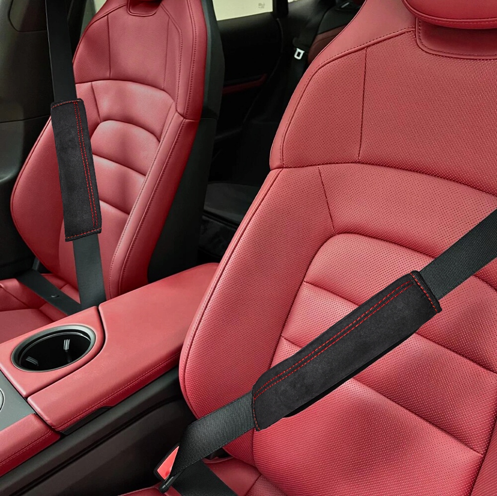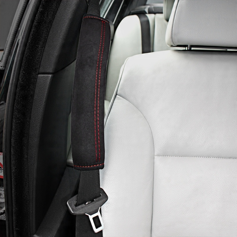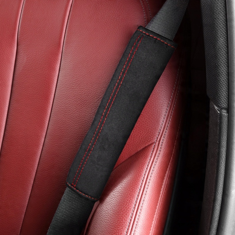 Накладки виготовлені з елегантного матеріалу ALCANTARA, прошиті міцними оббивними нитками та мають кант по краях. Вони наповнені м’яким шаром губки, що покращує комфорт під час подорожі та запобігає врізанню ременя в тіло.