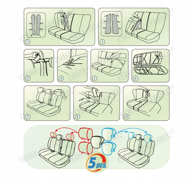 Чипка заднього сидіння поставляється з п’ятьма чохлами для підголівників – 2 підголівники класичної форми чохли та 3 «плоскі» чохли на підголівники. Клієнт вибирає 3 підходящі для свого автомобіля і залишає 2 як запасні.