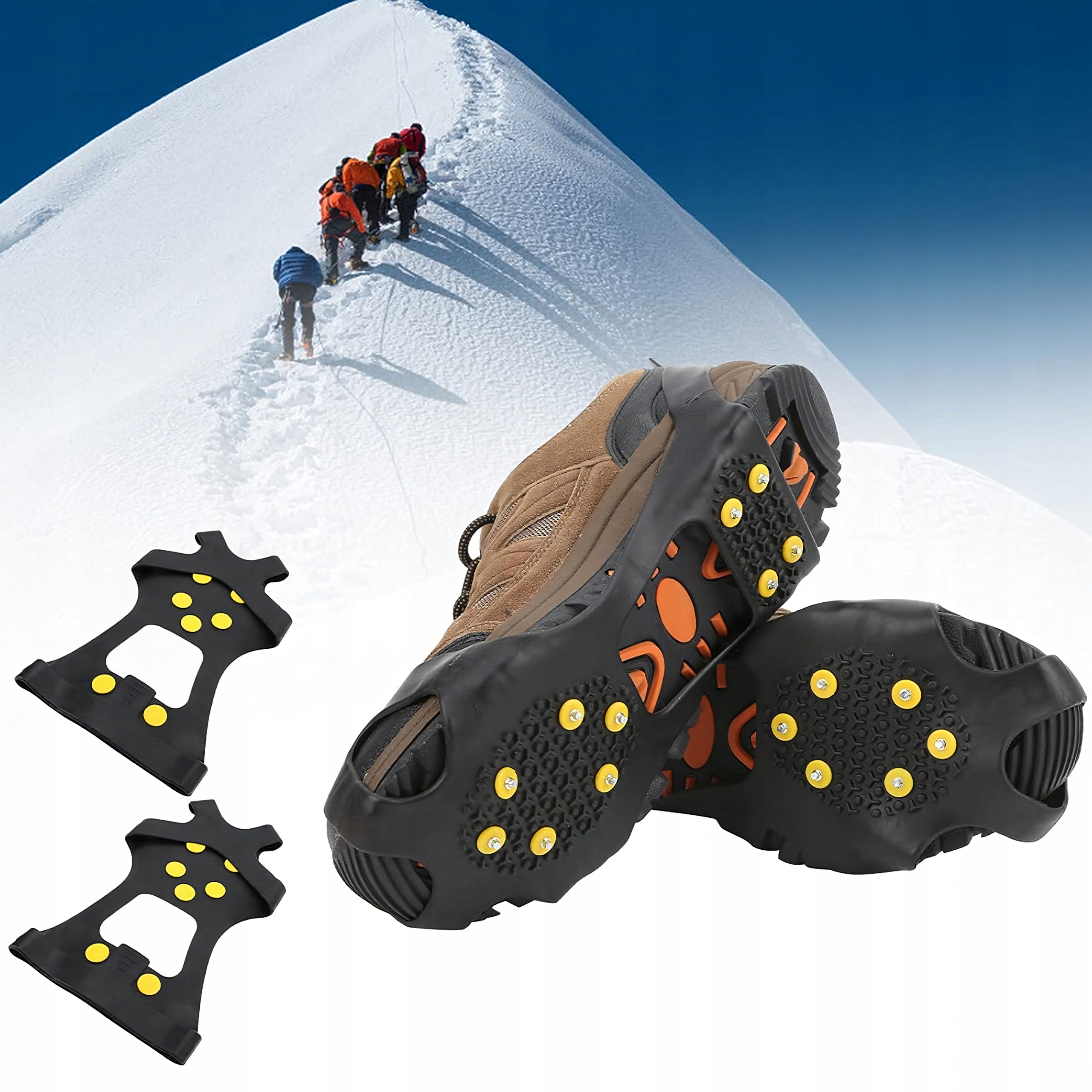 Еластичні, протиковзкі кошики для взуття надійно захищають від ковзання на снігу, льоду чи бруду. Виготовлені з міцної гуми TPE і металу, вони гарантують впевнений крок за будь-яких умов. 10 металевих шипів забезпечують стійкість і зчеплення на крижаних поверхнях. Легкий, гнучкий і компактний, ідеально підходить для походів, польових робіт і повсякденних зимових прогулянок.