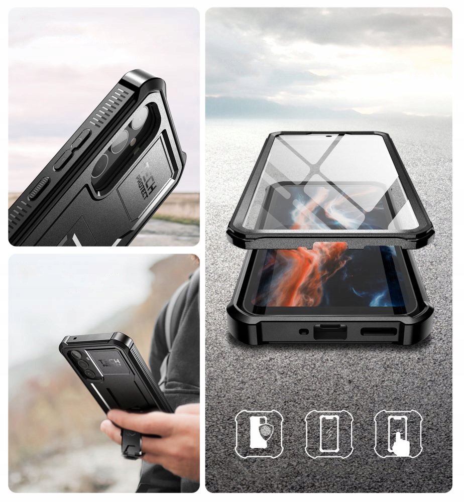 Чохол з двох частин поєднує в собі жорстку броню, розміщену на задній частині, виготовлену з ПК-покриття та амортизатор. стійкий ТПУ. Додаткове посилення в кутах - захисні подушки безпеки - ефективно амортизують будь-яке падіння. Передня частина пристрою оточена рамою з інтегрованою кришкою з полікарбонату. Це рішення ідеально відокремлює дисплей, захищаючи його від подряпин.