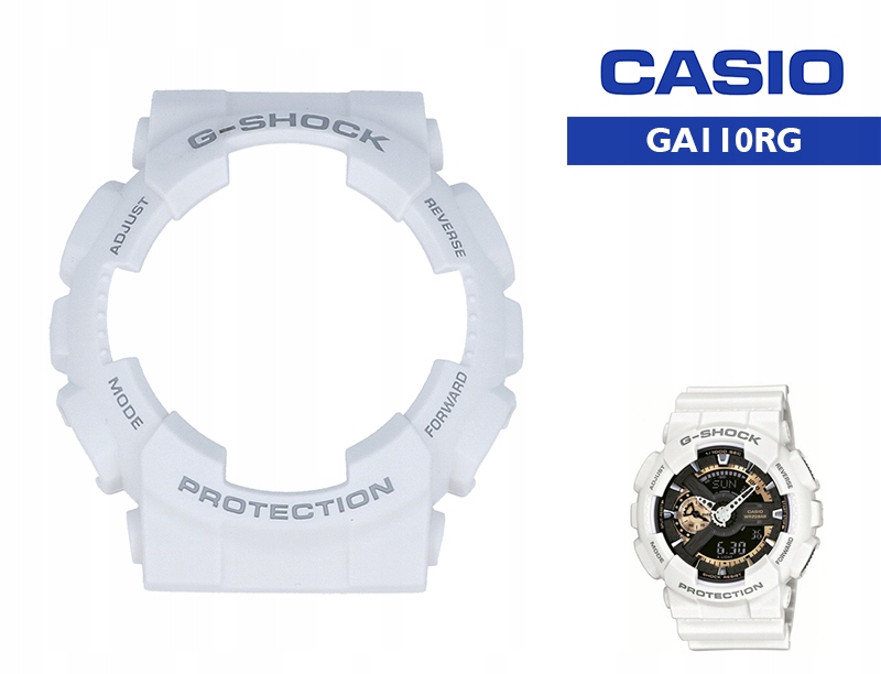 Оригінальна кришка корпусу, розроблена для моделі годинника CASIO G-Shock GA-110RG. Виріб має білий, матовий колір і сірі написи. Безель виготовлений з високоякісного матеріалу з великою гнучкістю, що забезпечує стійкість до механізму годинника під час щоденного використання. Будь-яка людина може легко замінити корпус, для цього не потрібні спеціальні інструменти. Це ідеальне доповнення, яке надає годиннику сучасного та елегантного характеру, а також забезпечує захист від пошкоджень.