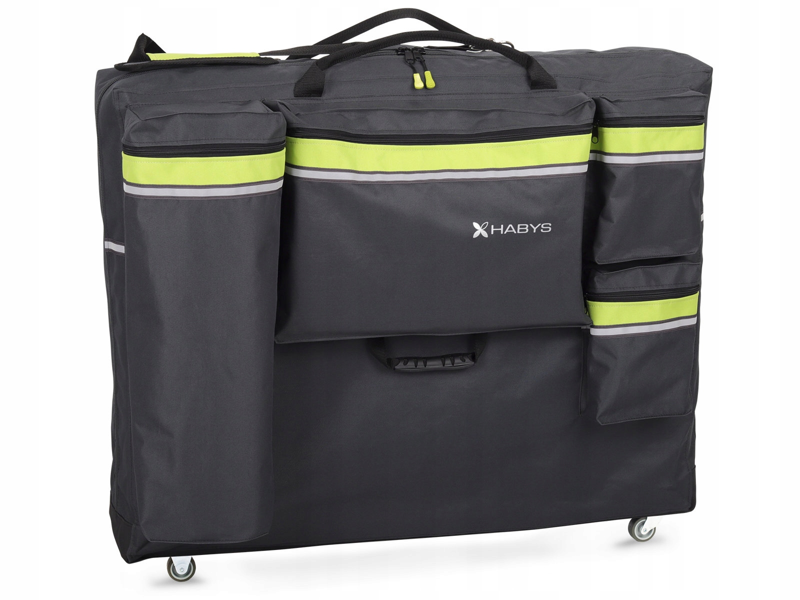 Чохол City від Habys - найбільш об'ємний і функціональний чохол, призначений для перенесення і транспортування розкладних масажних столів. У 4 містких кишенях помістяться необхідні аксесуари, наприклад, рушник, напіввалик, бамбукові палички або запас косметики. Зручний плечовий ремінь з м'якою вставкою запобігає появі синців на плечі. Ручка для транспортування забезпечує зручний підйом. Світловідбивачі, розміщені з боків, забезпечують більшу безпеку під час пересування у вечірній час. Чохол City виготовлено з дуже міцного матеріалу, зі спеціальним прогумованим дном, що робить його найкращим захистом для вашого столу під час щоденних транспортувань.
