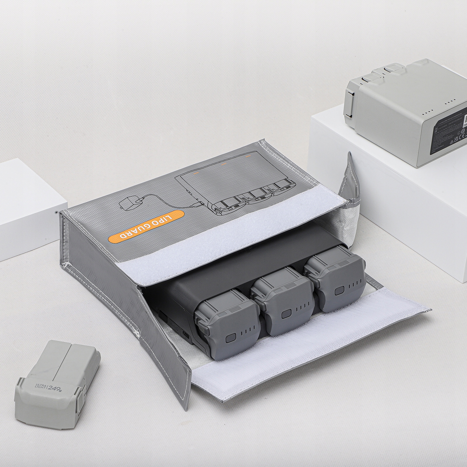 Чохол вміщує, зокрема, 3 акумулятори та зарядний пристрій для дронів: