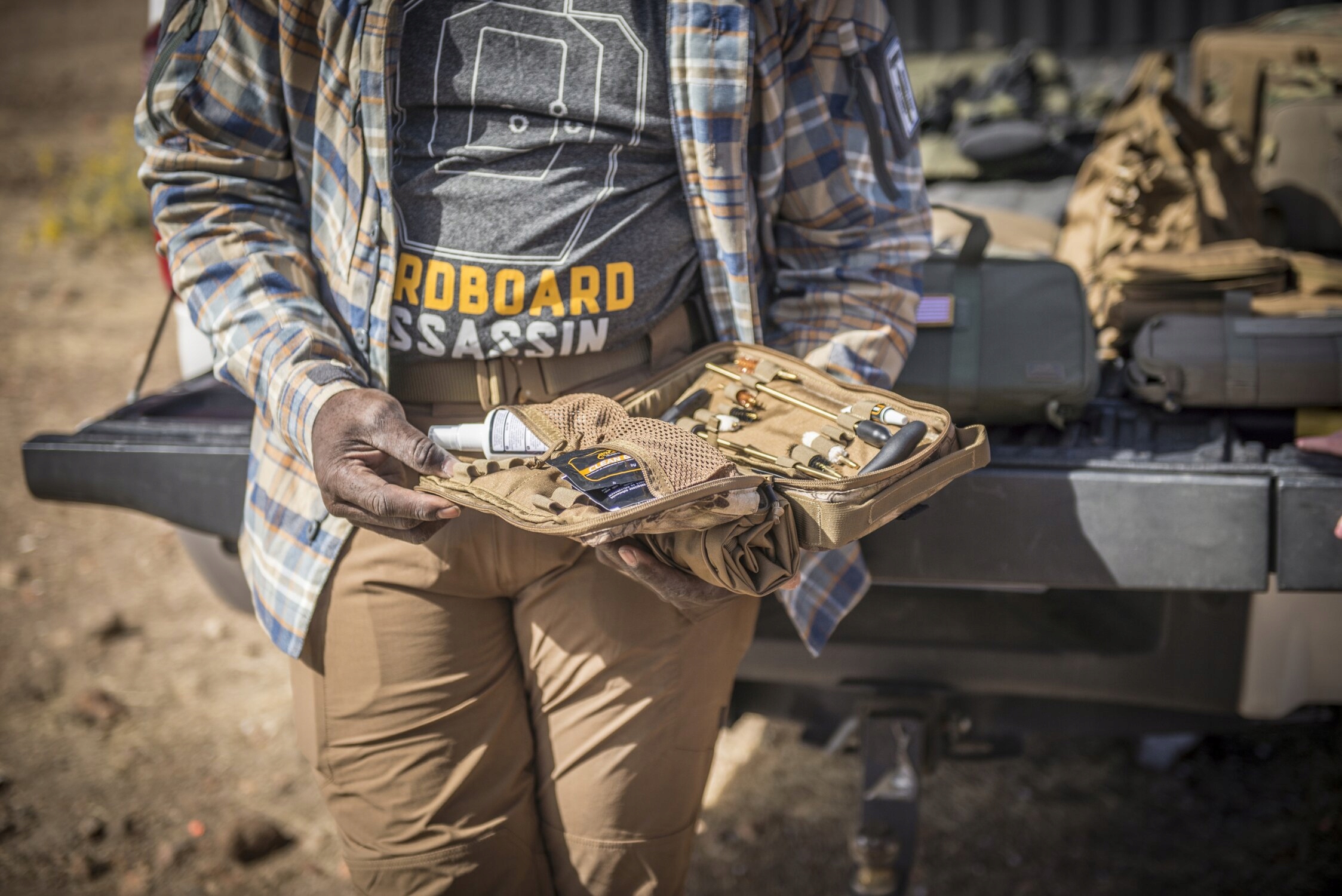 Кишеню для засобів для чищення зброї було створено, щоб доповнити більші сумки для стрільби. Незалежно від того, перебуваєте ви в тирі чи вдома, у вас є велика кишеня зі спеціальним органайзером, щоб упакувати основні засоби для чищення та догляду, інструменти, запчастини та багато інших необхідних речей. Внутрішній простір розділений на дві частини: фіксовану (сітчасті кишені на блискавці та еластичні петлі) і відстібну. Жорстке дно Service Case® вкрите контрастною тканиною, щоб допомогти розпізнати дрібні елементи. Додатково є килимок і лоток для чищення пістолетів і рушниць, які переносяться під чохлом, в еластичному шнуротримачі. Для створення цього набору використовувався досвід багатьох професійних користувачів.