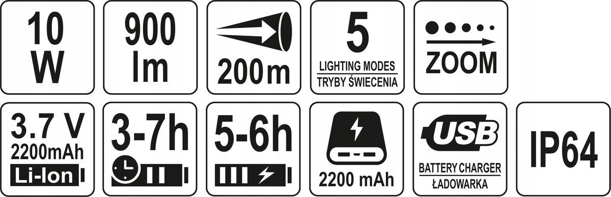 ЛІХТАРИК АКУМУЛЯТОРНИЙ 10W 900LM IP64, LI-ION 3.7V 2200MAH, ДАЛЬНІСТЬ: 200M, POWERBANK, ZOOM
