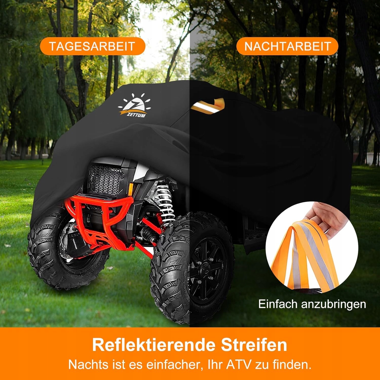 - Вітрозахисна конструкція з розумною пряжкою – покращена конструкція швидкого від’єднання із застібкою на липучці тримає чохол надзвичайно надійним на вашому квадроциклі, жоден вітер не здує ваш капот квадроцикла! Поставляється з портативною сумкою для зберігання та тканиною для щоденного чищення. Ви заслуговуєте на чохол для квадроцикла Zettum, який коштує кожного пенні! !